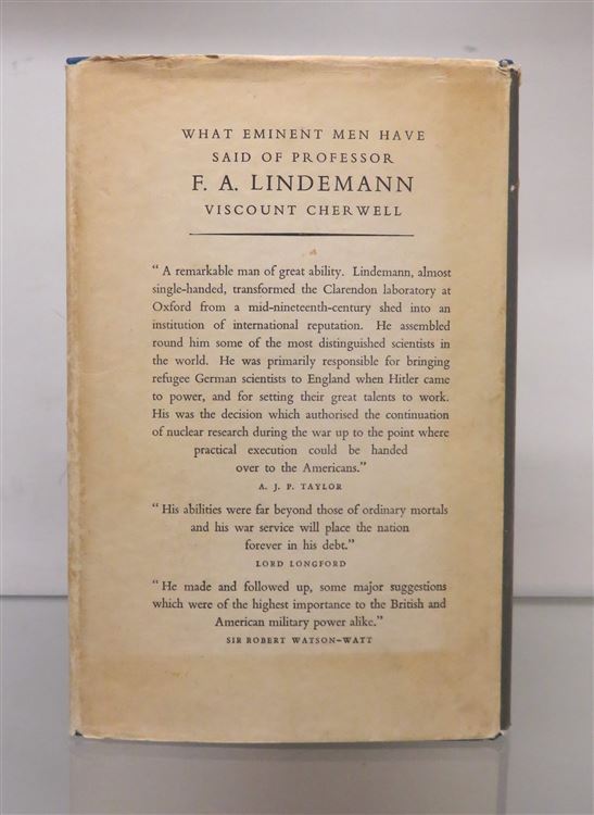 The officil life of F.A. Lindemann, Viscount Cherwell.Bound in blue cloth. Illustrated with black and white photographs throughout. Overall, the book is in good condition and comes in a dust jacket, which is also in good condition with only some slight tearing to the top. pp. 382.