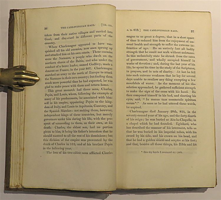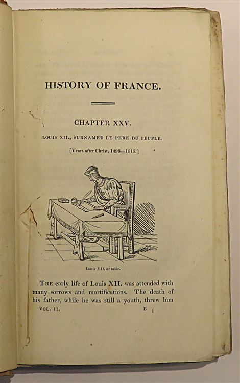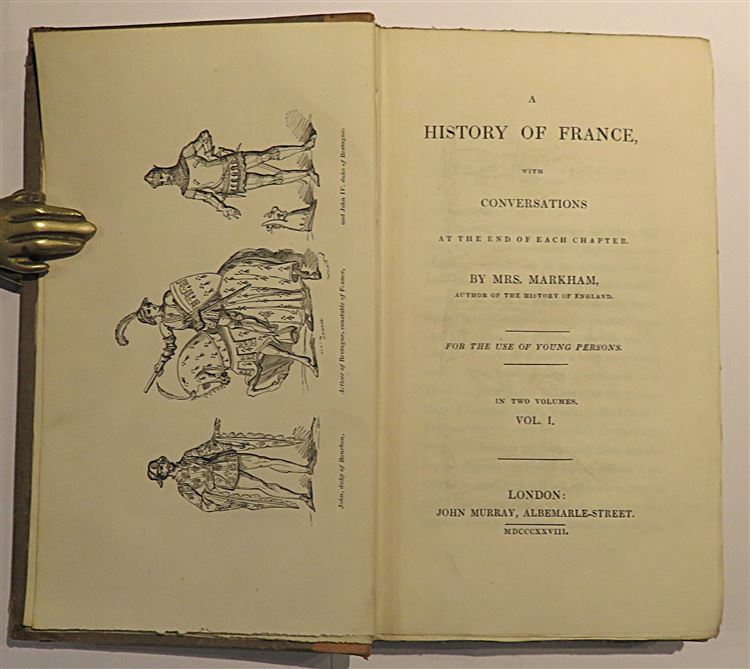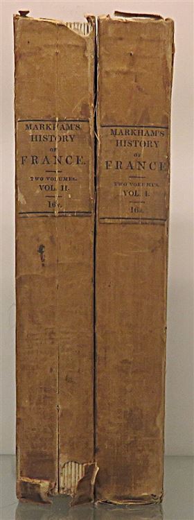 Hardback. First Edition. For the Use of Young Person. Publisher's original cream cloth spines with paper covered boards. The spines are a little delicate with a little loss, however the original paper titled bands are present and mostly intact. Small neat signature to the front with bumping to the corners although generally in good condition. Fore-edges untrimmed. The text-block to volume two is a little loose with pages 3 to 22 loose and closed tears to page 2. A few page corners have been creased by the corners while the frontispiece of volume one remains uncut. The pages are very clean throughout despite the very occasional spot of foxing. Volume one, pp. xii + . 475. Volume two, pp. 498 + 2. Overall a good set. Written under her Pseudonym of Mrs Markham, Elizabeth Penrose gained celebrity writing books for the young. A History of France was both popular in America as well as England and was written without any political thought or with any of the horrors of history.