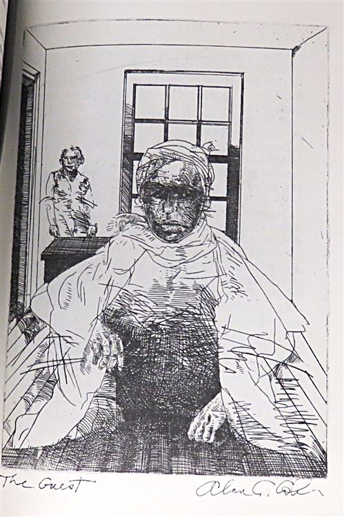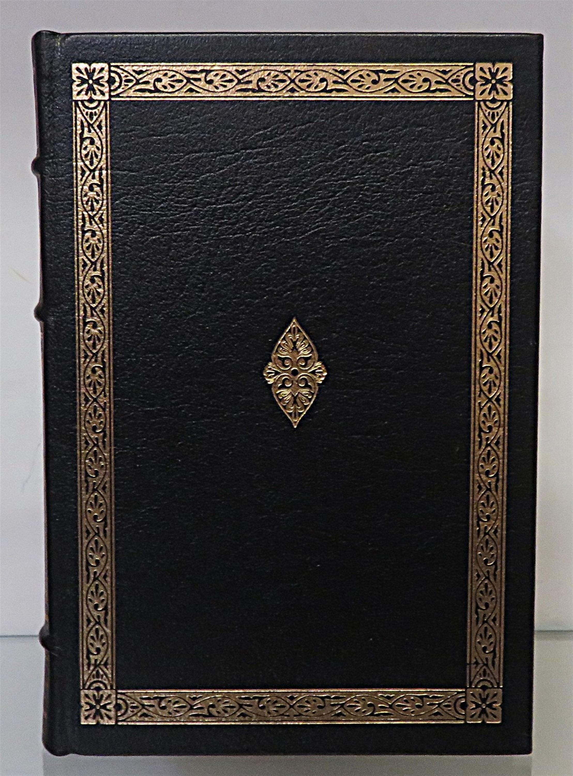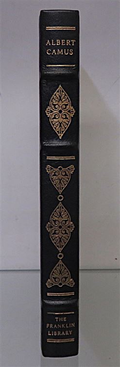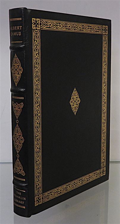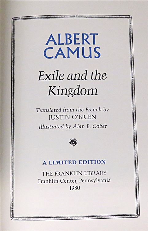 This lovely hardback limited edition Franklin Library copy of Albert Camus' "Exile and the Kingdom", translated by Justin O'Brien, is beautifully bound in black leather.The book is opulently decorated, with all-edge gilt, as well as gilt decorations, lettering, and illustrations on the cover and spine. This impeccable presentation continues inside the book, which has lovely grey silk endpapers, a satin ribbon page marker, and a playful use of blue and black ink for chapter titles and other interior decorations. Alan E. Cober's imaginative black ink illustrations add a sombre feel, and help to ground the story and its characters in Camus' overarching theme of human loneliness, and feeling isolated in one's own society. This book has 160 pages of text, and apart from some minor fading to the silk endpapers, the book's interior is in near perfect condition, and it appears unread. This book is looking for a new home, and would be a lovely gift for any collectors of Franklin Library's limited edition works, for any students of philosophy, or any fans of Albert Camus.