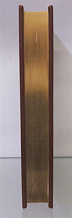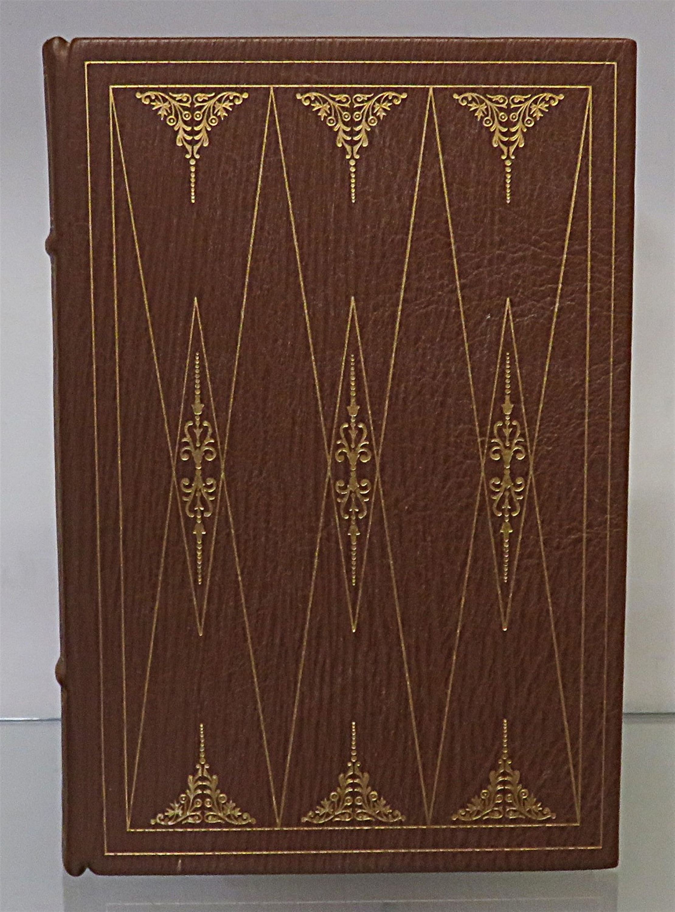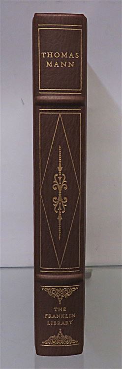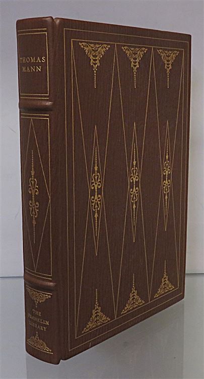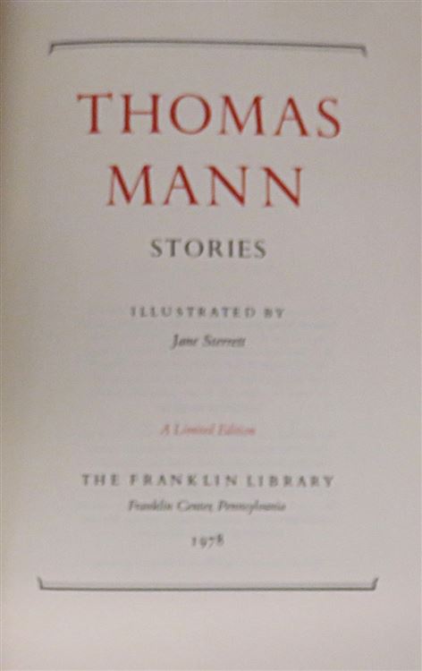 This lovely hardback limited edition Franklin Library copy of Thomas Mann's "Stories" is beautifully bound in brown leather. The book is opulently decorated, with all-edge gilt, as well as gilt decorations, lettering, and illustrations on the cover and spine. This impeccable presentation continues inside the book, which has lovely yellow ochre silk endpapers, a satin ribbon page marker, and a playful use of brown and black ink for chapter titles and other interior decorations. Jane Sterrett's imaginative black and red ink illustrations help to ground the stories and their characters, as one experiences Thomas Mann's powerful insights into the psychology of the artist and the intellectual. This book has 317 pages of text, and is in near perfect condition, as its pages appear unread. This book is looking for a new home, and would be a lovely gift for any collectors of limited edition Franklin Library books, or for any fans of Thomas Mann.