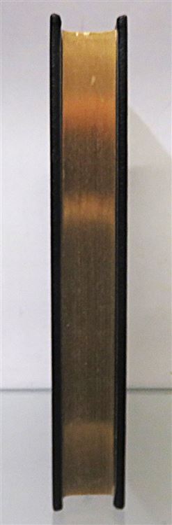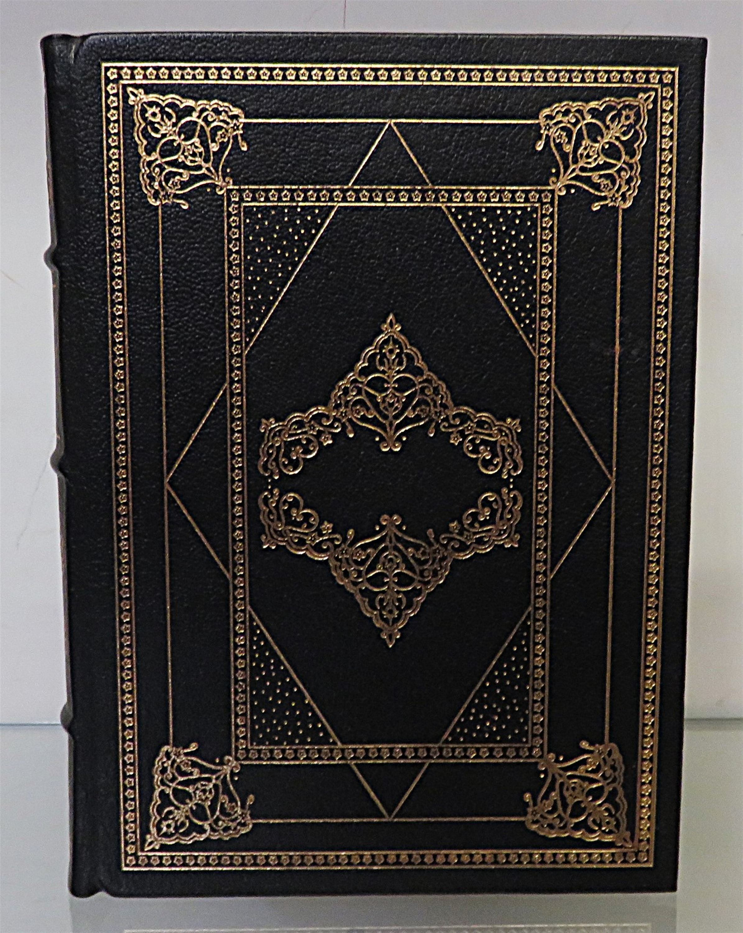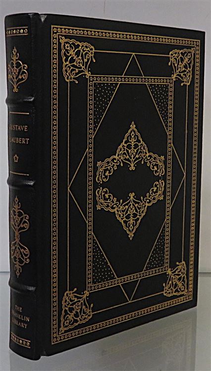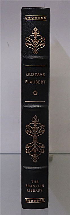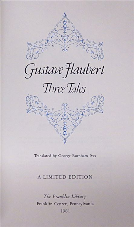 This lovely hardback limited edition Franklin Library copy of Gustave Flaubert's "Three Tales" is beautifully bound in black leather. The book is opulently decorated, with all-edge gilt, as well as gilt decorations, lettering, and illustrations on the cover and spine. This impeccable presentation continues inside the book, which has purple silk endpapers, a satin ribbon page marker, and a playful use of blue and black ink for chapter titles and other interior decorations. The beautiful woodcuttings by Andre Deslignieres, Jean Lebedeff, and Georges Lemeilleur perfectly compliment the three tales inside: A Simple Heart, The Legend of St Julian the Hospitaller, and Herodias. This book has 199 pages of text, and apart from some minor fading to the silk endpapers, it is in near perfect condition, and its pages appear unread. This book is looking for a new home, and would be a lovely gift for any collectors of limited edition Franklin Library books, or for any fans of Gustave Flaubert.