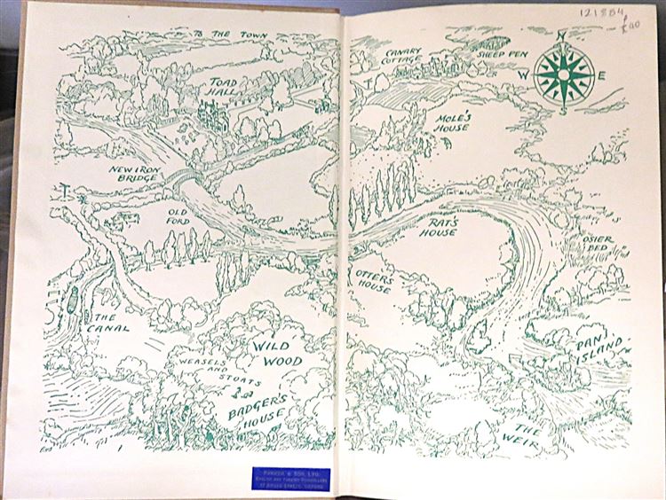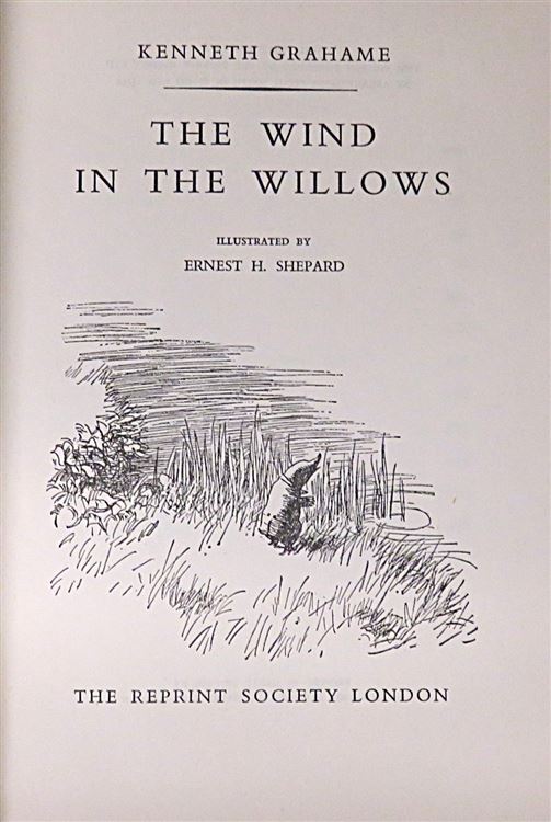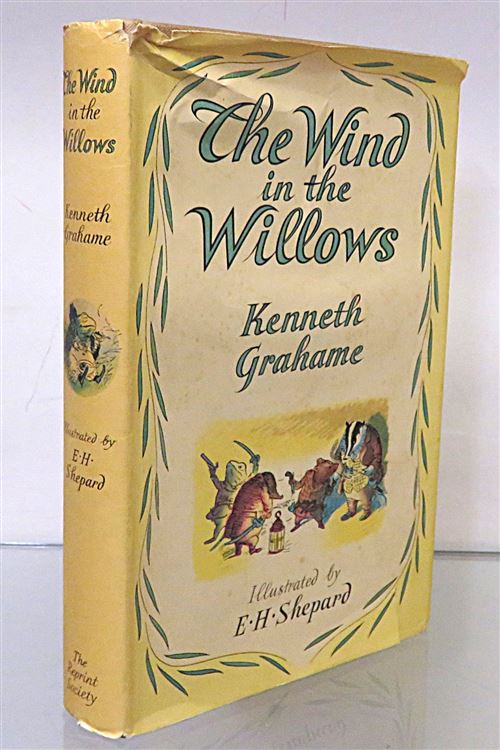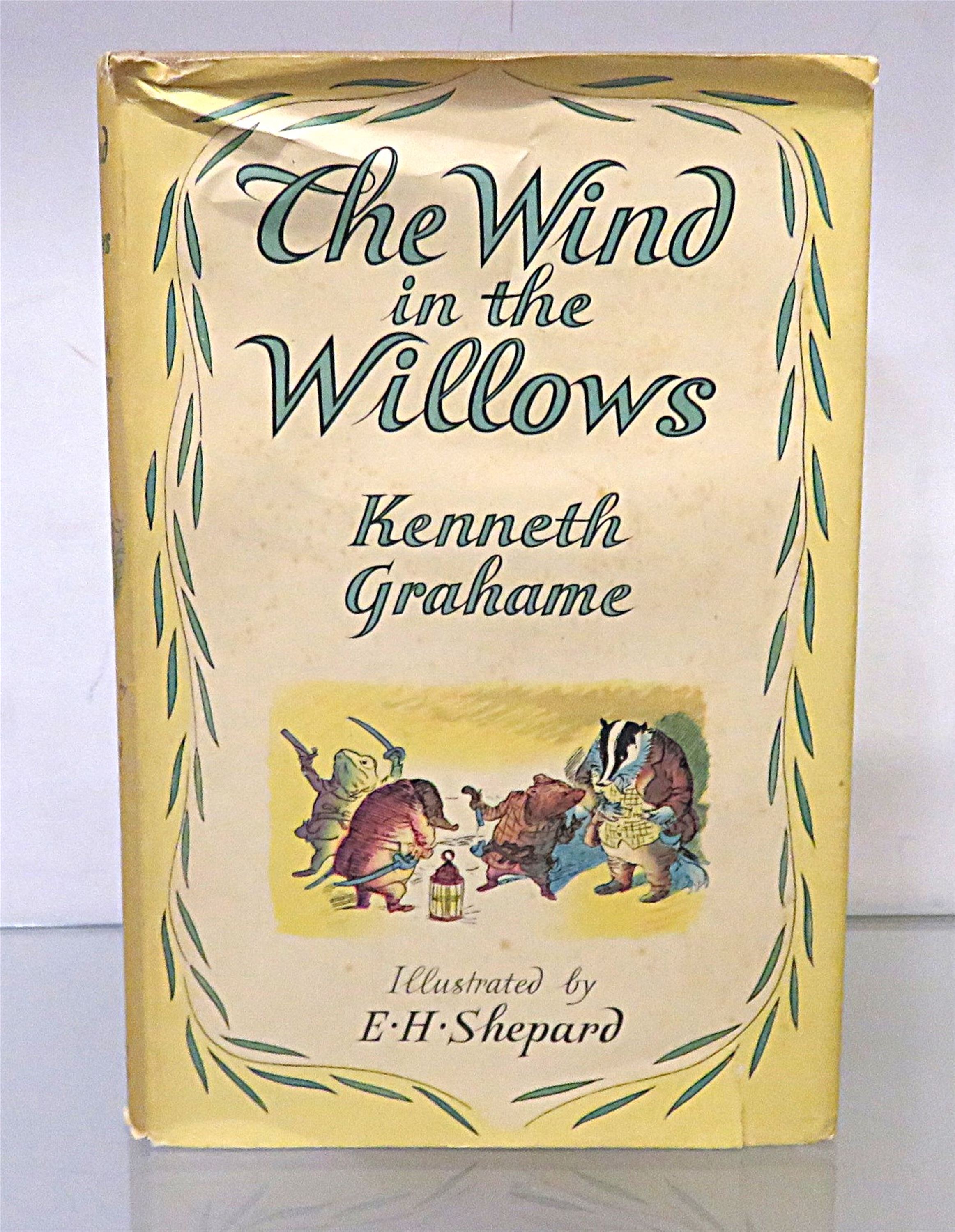 A lovely hardback clothbound edition of Kenneth Grahame's "The Wind in the Willows", housed in a charming pictoral dustjacket illustrated by Ernest H. Shepherd. Underneath the dustjacket, one finds beautiful brown and green ink etchings of willow leaves and forest creatures on the books beige cloth binding. Inside the book, one is met with a beautifully illustrated map in green ink, which adds to the sense of whimsy and helps to situate the reader within the world of the characters. This book has 320 pages of text, with charming black ink illustrations throughout. Other than some minor tears and discolouration to the dustjacket, and some foxing, the book itself is in great condition. This book is looking for a new home, and would make for a lovely gift for any fans of Kenneth Grahame's work.