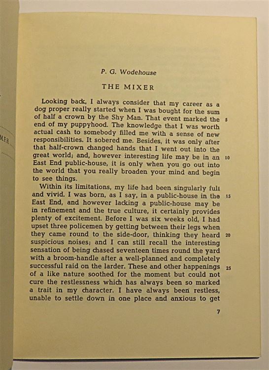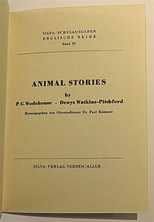 Silva Schulausgaben- Englische Reihe Band 29. Quarter bound in green cloth with card covers in very good codnition despite toning to the extremities. A lovely little book containing two stories, The Mixer by P.G. Wodehouse and Sir Timothy M.F.H. by Denys Watkins-Pitchford. Both stories are in English with introduction and index to the rear in German. pp. 44 + 3. Scarce copy.