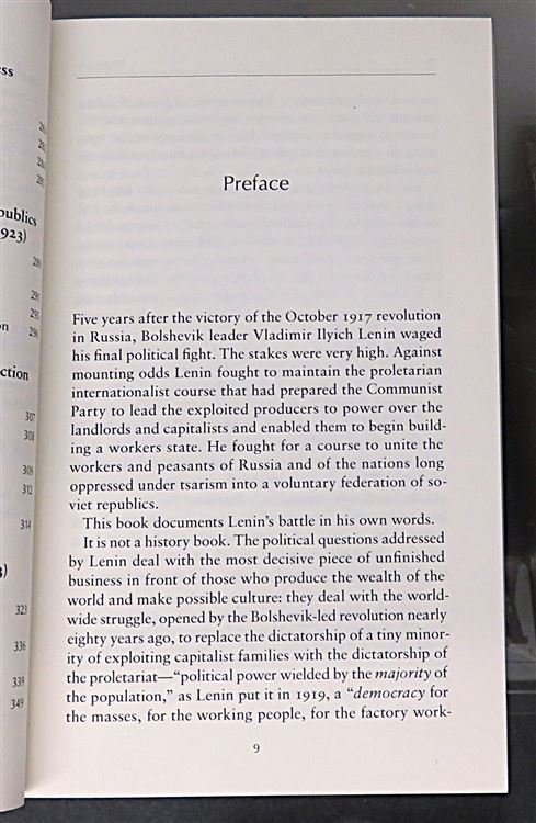 A very good clean copy with pictorial card covers showing very little wear. The pages within appear unread. pp. 358 + 14. This book compiles the speeches, articles, letters, and memos in which Lenin took up the battle inside the Bolshevik Party.
