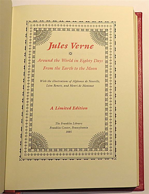 Hardback. A very good copy expertly bound by The Franklin Library. Limited Edition and part of The Franklin Library's The World's Greatest Writers Series. Handsomely bound in full red leather with gilt decoration to the sides and spine. All edges gilt. Beautiful rich red silk endpapers and ribbon bookmark complete the luxurious feel of the book. There is a little bumping to the rear board at the top of the spine and the gilt along the top edge is lightly worn. Otherwise this is a very good copy in near perfect condition. pp. 357. The perfect gift for any Jules Verne fan.