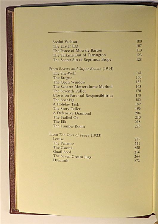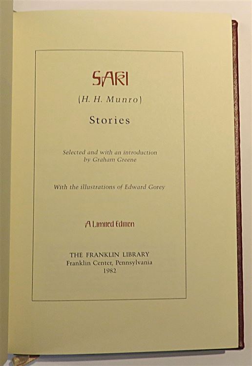 Hardback. A Limited Edition published by The Franklin Library exclusively for subscribers of The Collected Stories of The Worlds Greatest Writers. A beautiful copy bound in full leather with intricate gilt design to the sides. All edges gilt. Silk endpapers and ribbon bookmark. A very good copy despite light fading to the spine. The pages are beautifully clean and illustrated by Edward Gorey. pp. 279. Selected and introduced by Graham Greene. A collection of short stories by H.H. Munro satirising Edwardian culture and society.