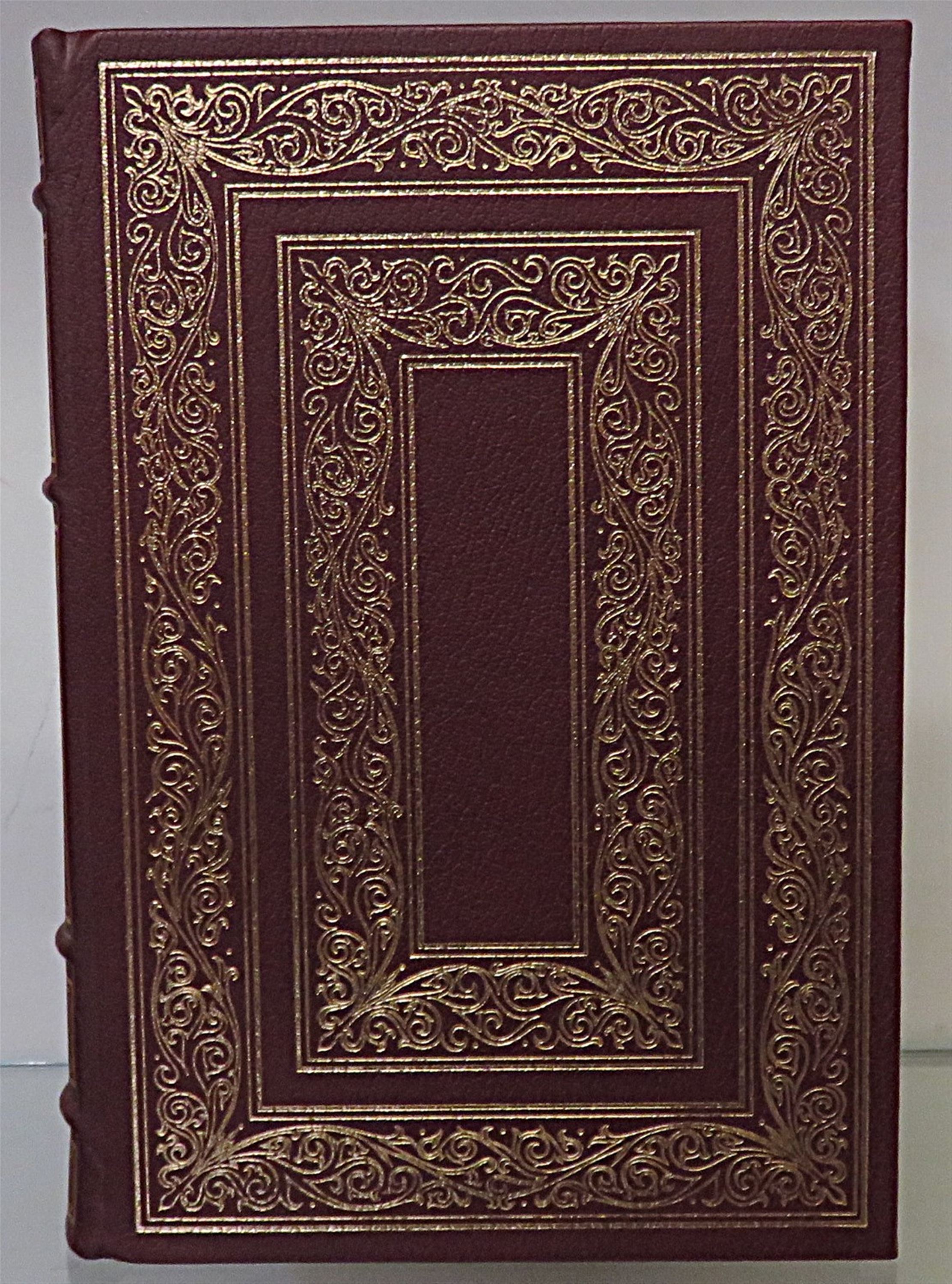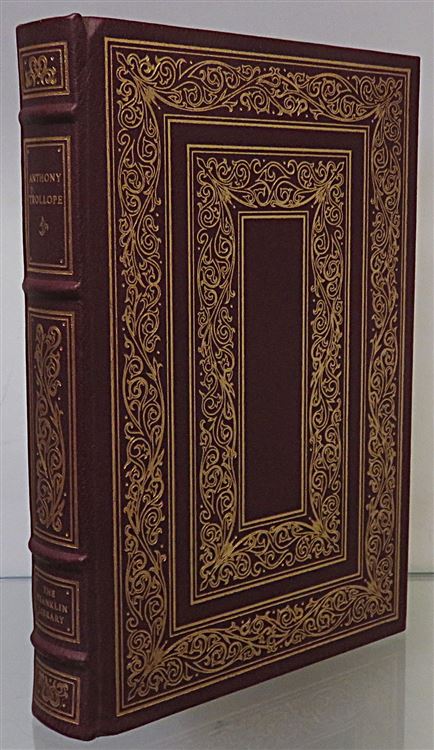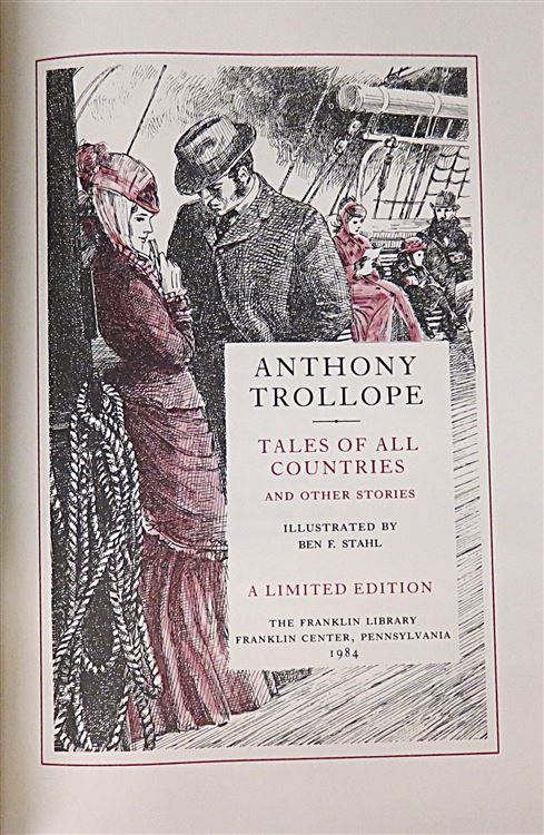 This lovely hardback limited edition Franklin Library copy of Anthony Trollope's "Tales of all Countries and Other Stories" is beautifully bound in burgundy leather. The book is opulently decorated, with all-edge gilt, as well as gilt decorations, lettering, and illustrations on the cover and spine. This impeccable presentation continues inside the book, which has lovely deep red silk endpapers, a satin ribbon page marker, and a playful use of brown and black ink for chapter titles and other interior decorations. Ben F. Stahl's imaginative black and red ink illustrations help to ground the story and its characters, as the reader navigates through the variety of contexts, cultures, human behaviours, and social norms that Trollope writes about. This book has 379 pages of text, and is in near perfect condition, as its pages appear unread. This book is looking for a new home, and would be a lovely gift for collectors of limited edition Franklin Library books, or for any fans of "Tales of all Countries".