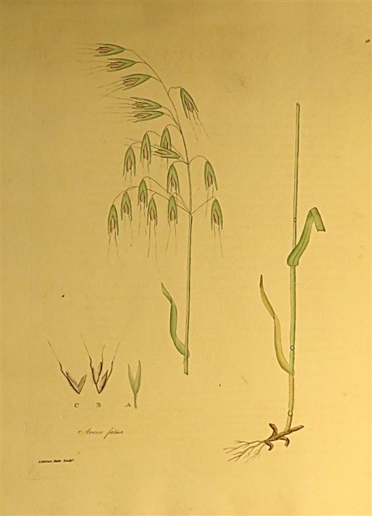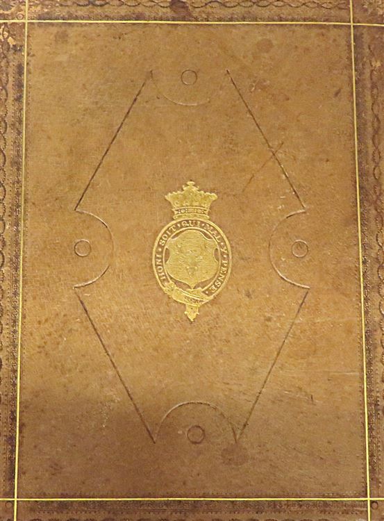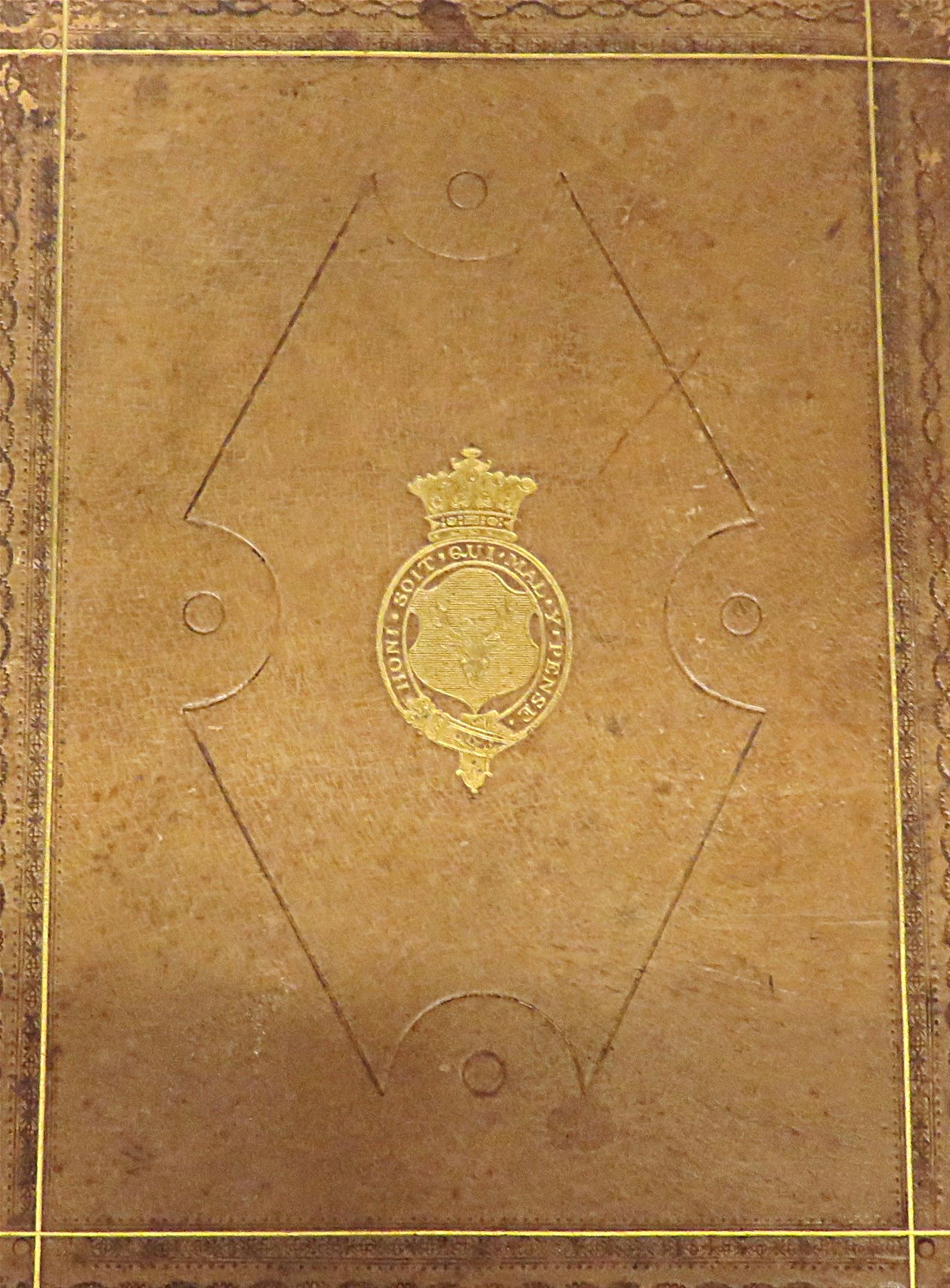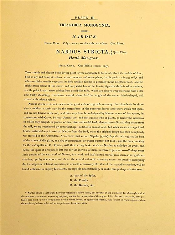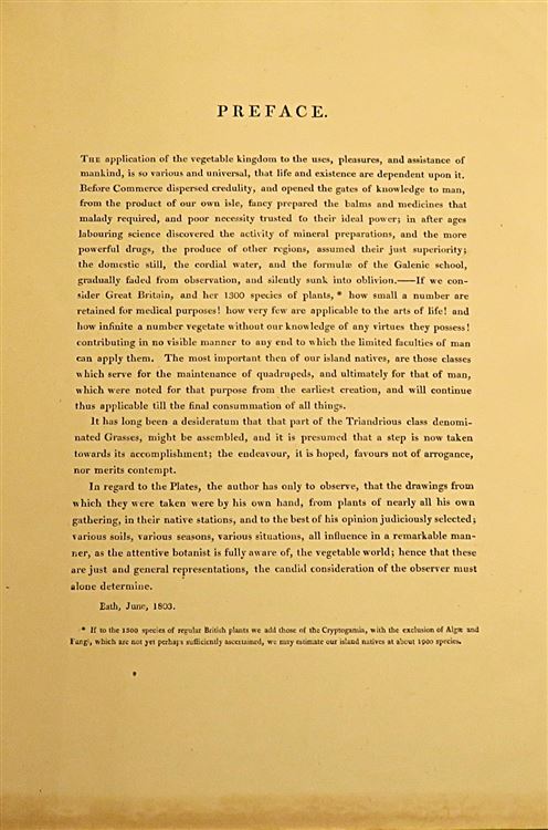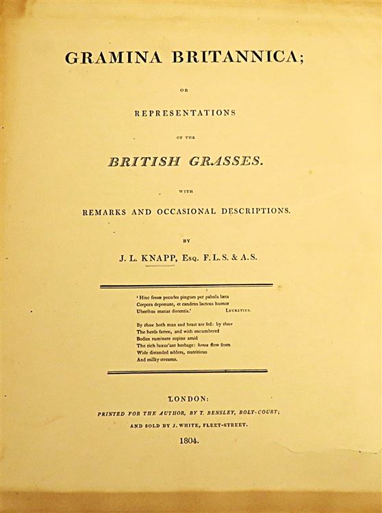 Gramina Britannica; or Representations of the British Grasses with remarks and occasional descriptions by J. L. Knapp, Esq. F. L. S. & A. S. This rebacked 1804 work has a beautiful full leather Morocco binding with stunning gilt borders and blind tooling. This regimental binding features a gilt coat of arms, which depicts a stag's head and crown. The motto "honi soit qui mal y pense", or "shamed be whoever thinks ill of it", stems from the British chivalric Order of the Garter, the highest of all British knighthoods - a motto which has since been adopted by a variety of British military and civilian institutions. The gold coat of arms and borders are complimented by the book's all edge gilt. This attention to detail and impeccable presentation continues inside, as this edition includes all 124 pages with 119 plates which have been carefully hand-tinted. The colours still appear incredibly vibrant, and the tinting is to a high standard. Other than a closed tear and offsetting to the title page and preface, there is some minor foxing throughout the book, and the lack of image guards has caused some offsetting. This book is in great condition despite its age. This is a rare copy, not just due to its condition, but also as according to the minutes of the Linnean Society, only 100 copies were left after a fire at Bensley, this being one of them. This is a lovely collectors item for any historians of the early 1800s, or for any enthusiasts of natural history.