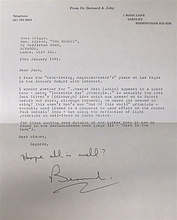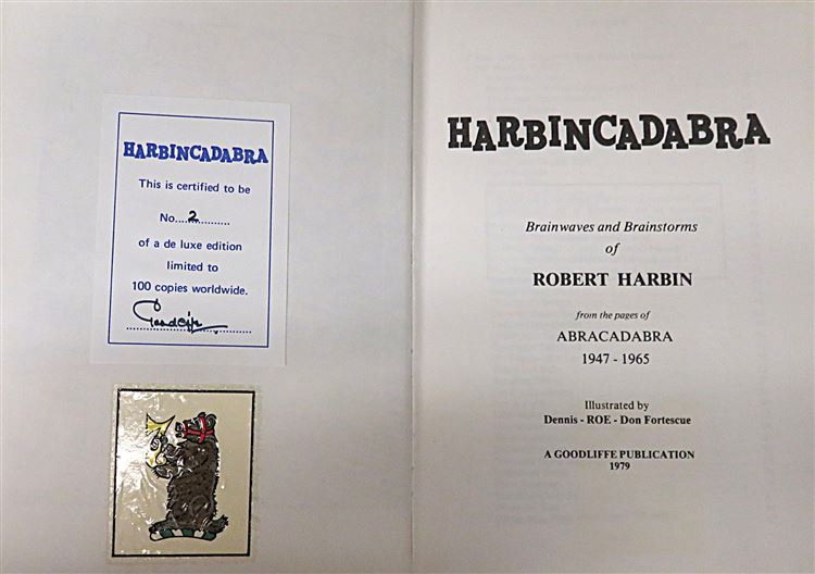 This beautiful leather bound hardback edition of "Harbincadabra" is copy 2 of only 100 printed worldwide. The book is beautifully presented, with all-edge gilt, and gilt lettering to the cover and spine. This impeccable presentation continues inside, as the books free endpapers depict newspaper clippings from some of the highlights of Harbin's career. Inside, one finds a series of "brainwaves and brainstorms" surrounding Harbin's most famous tricks throughout his career, compiled posthumously by his wife and friends, and aided with informative illustrations. This book contains 312 pages of text, and is in impeccable condition, appearing almost as-new. This work has come into the possession of St Mary's Books from the private collection of Dr Bernard Juby, a magician himself. Inside the box it is housed in sits correspondence and comments from Juby to friends, as well as a separate Harbin pamphlet. This item, and associated correspondence, is looking for a new home, and would make for a lovely gift for any budding collectors of magical works.