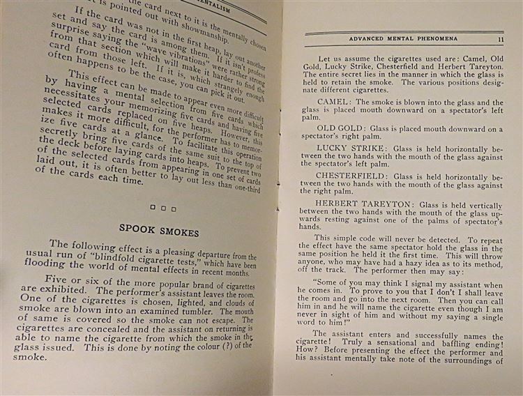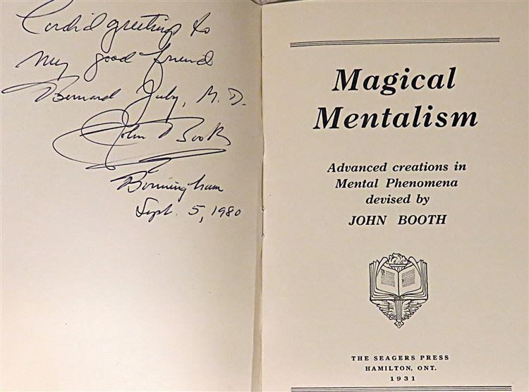 Magical Mentalism: Advanced creations in Mental Phenomena. This lovely 1931 paperback book on "Magical Mentalism" by John Booth is looking for a new home. With 34 pages of text, this smartly presented work is in great condition - apart from a few bumps and an inscription on the frontispiece, it is otherwise intact. This edition would be the perfect gift for the budding mentalist in your household, or for any magic historians of the 1930s.