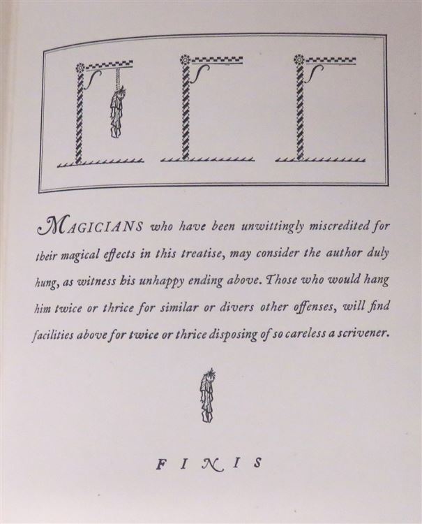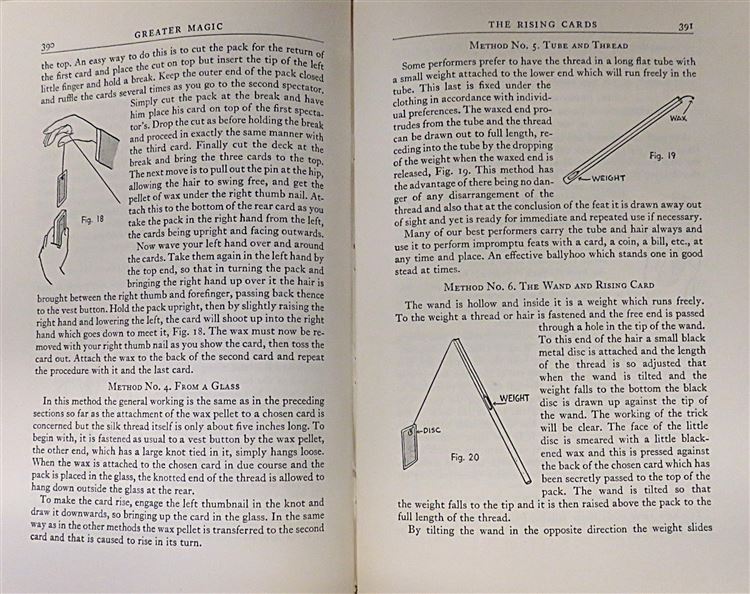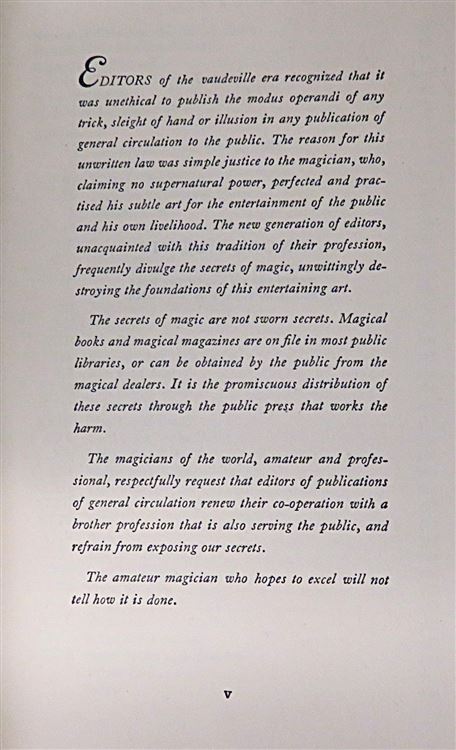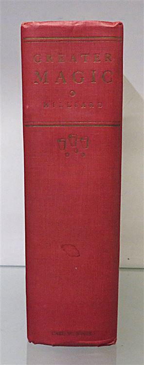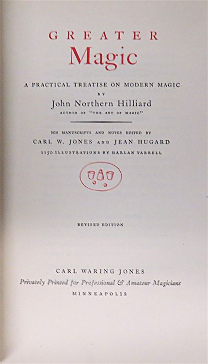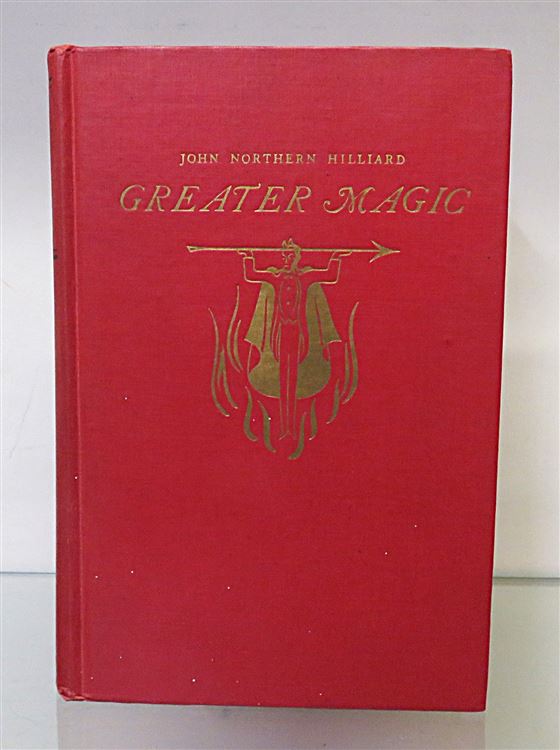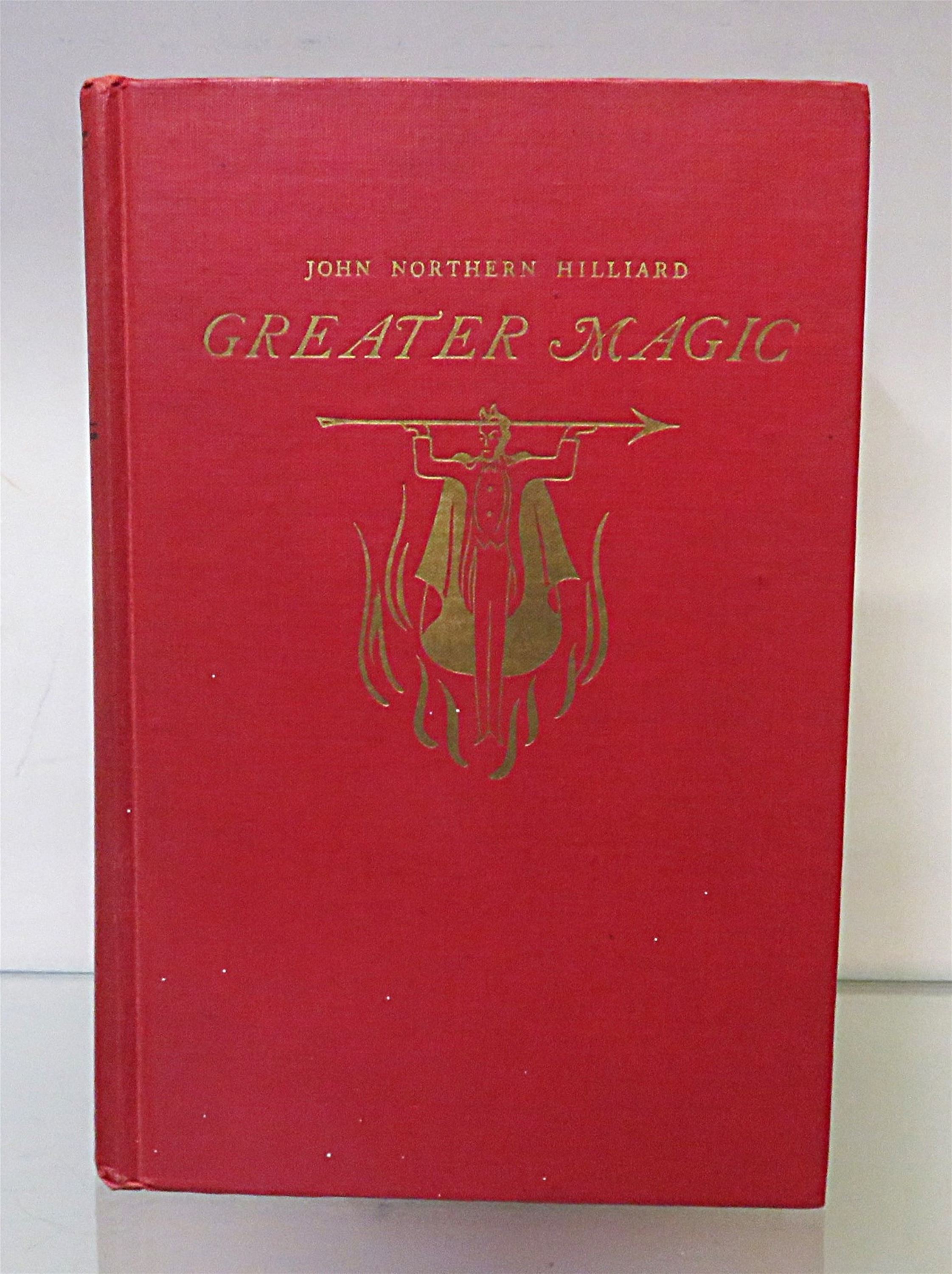 This stunning hardback edition of "Greater Magic: A Practical Treatise on Modern Magic" by John Northern Hillard is bound in a bright crimson cloth with gilt lettering and illustrations to the spine and cover. The cover depicts a magician in flames holding staff above his head, and the spine's illustration is three simple cups and balls. This impeccable presentation continues inside the book, which features a playful mixture of red and black ink for titles and other decorations. This book features 1007 pages of text, the instructional content of which is perfectly complimented by Harlan Tarbell's 1150 black ink illustrations which are peppered throughout. This book is in great condition despite its age, and has some lovely contemporary features, such as being printed "in compliance with the regulations of the War Production Board", as well as a call for the author to be hung if he has unduly miscredtied any magicians. This book is looking for a new home, and would be the perfect gift for any budding magic enthusiasts in your household.