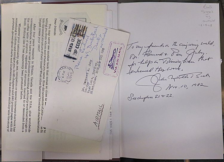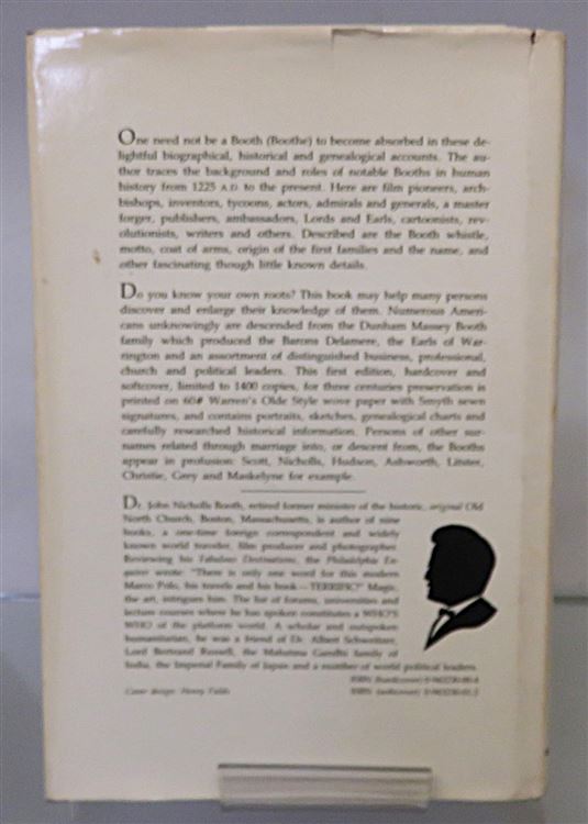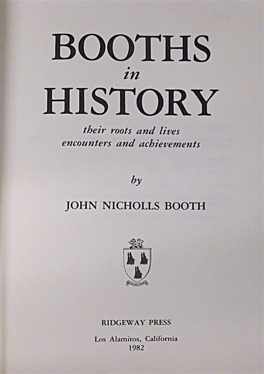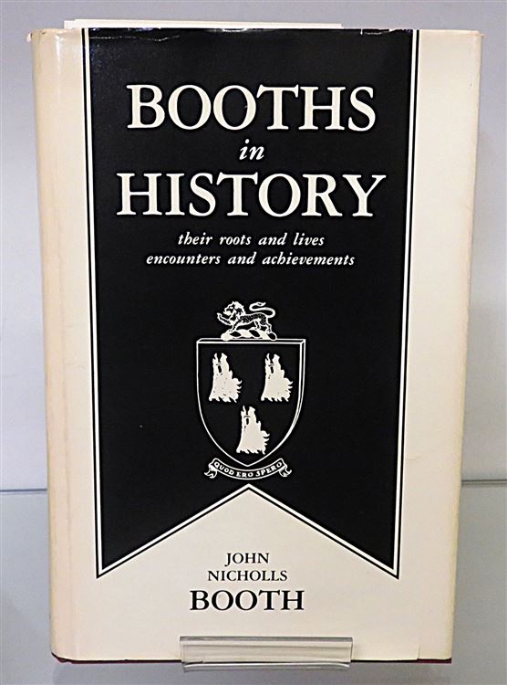This lovely signed edition of "Booths in History: their roots and lives, encounters and achievements" is signed by the author, John Nichols Booth, and is one of the 400 hardback first edition copies printed. Alongside the book, one can find correspondence between the author and Dr Bernard and Pam Juby, and copies of primary sources which they sent to aid the author in his work. This beautiful hardback copy is housed in a black and white dustjacket complete with the Booth crest. The book itself is bound in burgundy cloth, with gilt lettering to the spine. Inside, one finds 232 pages of text, including indicies. This book is in great condition - despite a small closed tear and some bumping to the dustjacket, the book itself is immaculate. This book is looking for a new home, and would be a lovely gift to anyone interested in heraldry.