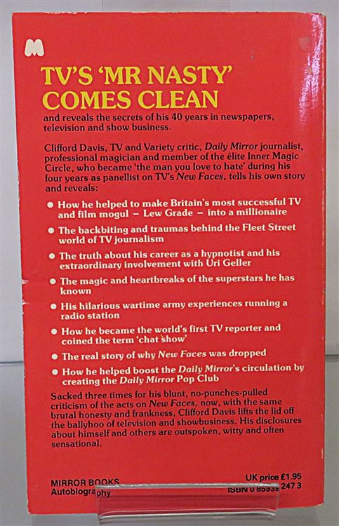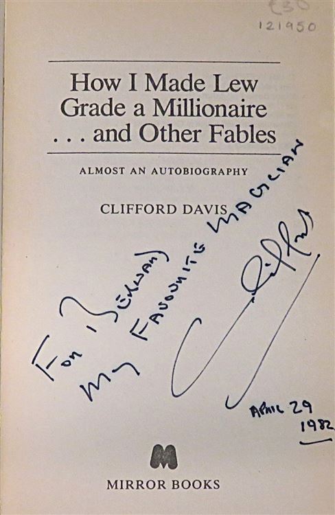 A lovely paperback edition of "How I made Lew Grade a Millionaire...and Other Fables", which has been signed by the author himself. Described as "almost an autobiography" by Clifford Davis (or "Mr Nasty"), the pictoral cover depicts Davis lighting the cigar of a shilouetted figure. Inside, one finds 208 pages of text including indicies. This book is in very good condition, with no visible damage apart from some fading and a fold to the spine. This book is looking for a new home, and would be a great gift for anyone interested in 1970s/80s Fleet Street culture, or the life of Clifford Davis.