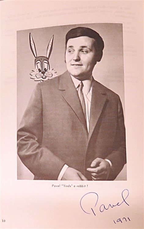 St Mary's Books is proud to present this lovely hardback edition of "The Magic of Pavel", signed by the author in both 1969 and 1971. Housed in a brightly coloured orange dustjacket with bold and striking illustrations of a rabbit and a magic wand, this beautiful blue clothbound book features gilt lettering to the spine and cover. Inside, one finds 139 pages of text, supplemented by Josef Manas and Pavel's black ink illustrations. This book is in good condition, the dustjacket has some signs of wear and a small tear to the back, the cover of the book is slightly stained, and there is a diagram drawn by a previous owner on one of the back pages. Despite that, this copy is otherwise very clean, readable, and undamaged. This book is looking for a new home, and would make for a lovely gift for anyone interested in Pavel the magician.