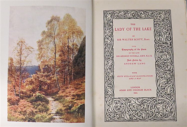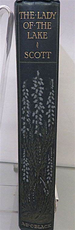 St Mary's Books is proud to present this beautiful 1904 reprint of Sir Walter Scott's "The Lady of the Lake". This hardback book is bound in a stunning forest green cloth, which has beautiful purple flowers inked on to the cover and spine, and gilt to its top edge. The spine also features the title and poet's name in gilt lettering. Inside, the book is impeccably presented - the title page playfully mixes red and black ink, and is complimented by ornate black ink decorations, and the frontispiece is a full colour illustation of a forest scene. This book has 159 pages of text, including 55 beautiful full page illustrations and a map. This lovely book is in fair to good condition, as there is some sloping to its spine and significant foxing throughout. This edition is looking for a new home, and would be the perfect gift for any poetry lovers.
