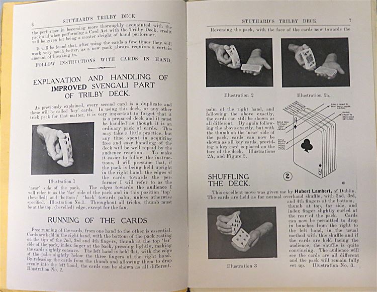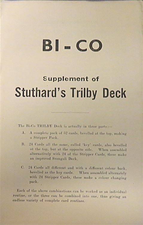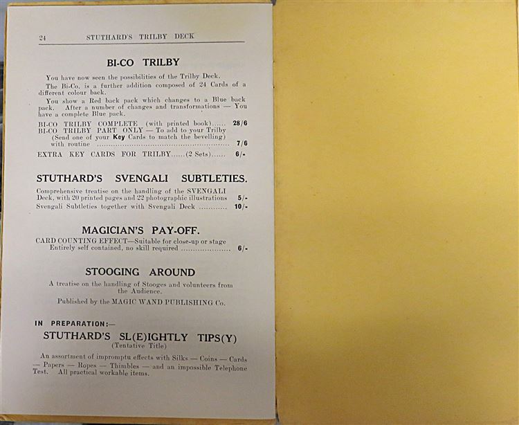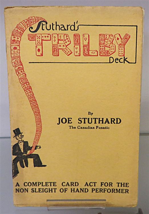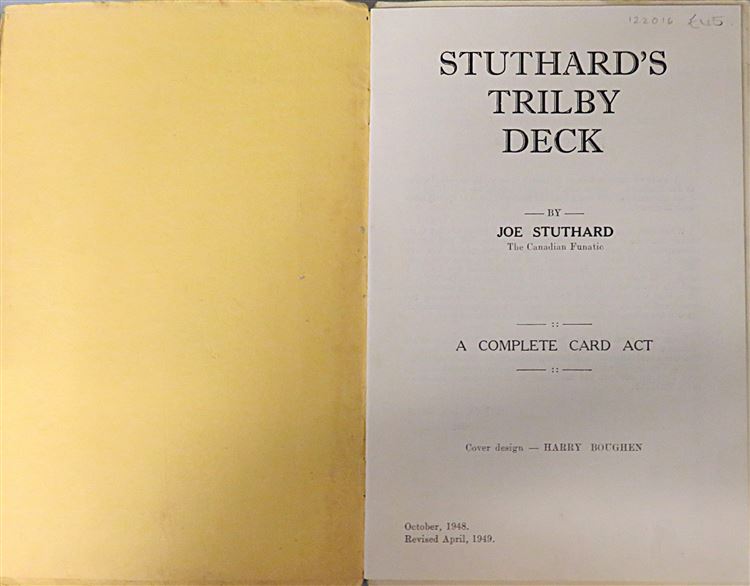 St Mary's Books is proud to present this lovely 1949 revised edition of "Suthard's Trilby Deck: A Complete Card Act for the Non Sleight of Hand Performer" by Joe Suthard. Bound in a lovely butter yellow paper with Harry Boughen's whimsical red and black ink illustrations to the cover, this lovely edition features 24 pages of text, complete with black and white photographs to aid the reader in mimicing the great Suthard. Tucked in to this edition, one can also find the small 4 page pamphlet, "Bi-Co" a supplement of "Suthard's Trilby Deck". This edition is in good condition, there are some small stains to the cover and a tear to the spine. Otherwise, this copy is clean and readable - particularly remarkable given its age. This little book (and supplementary pamphlet) is looking for a new home, and would be the perfect gift for any collector or amateur magician.
