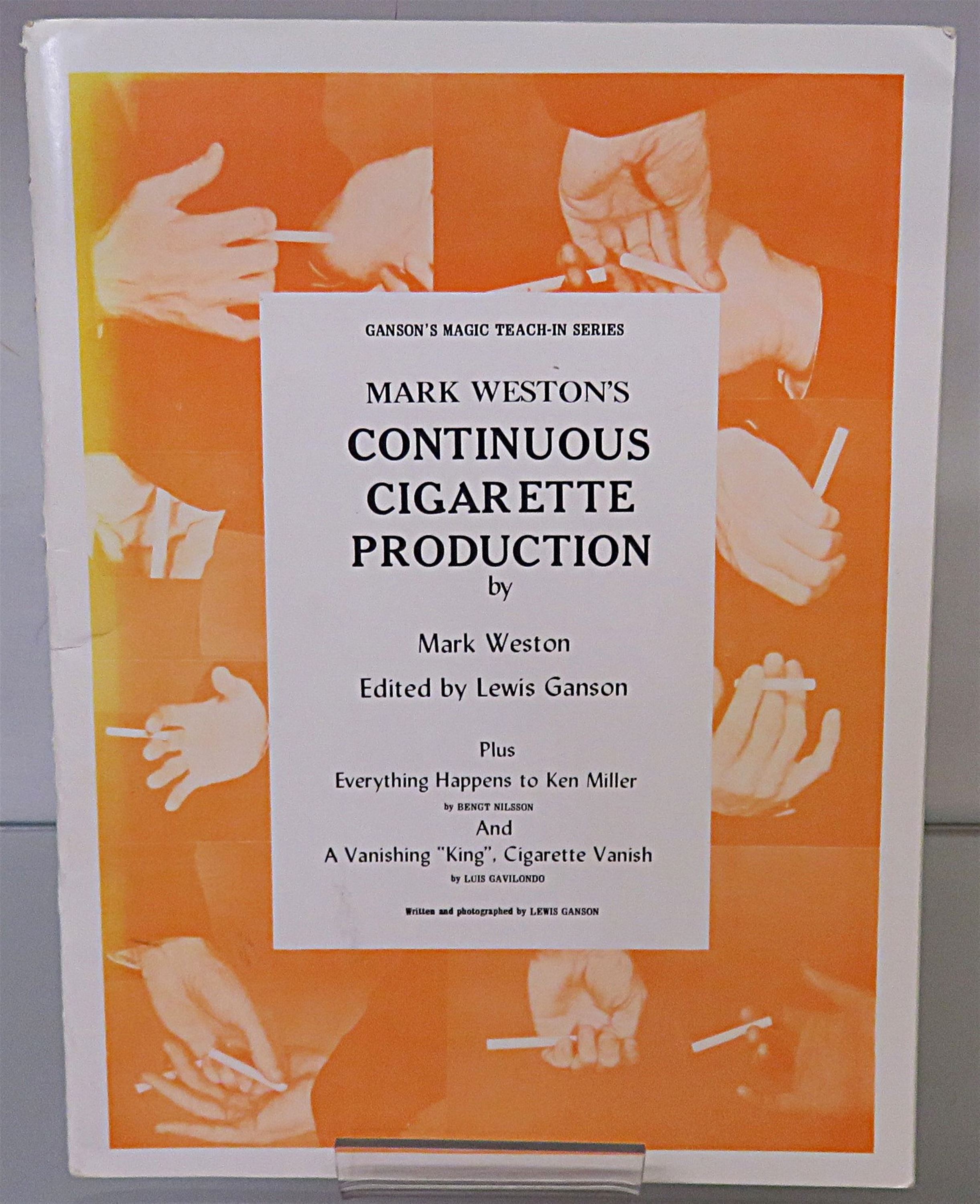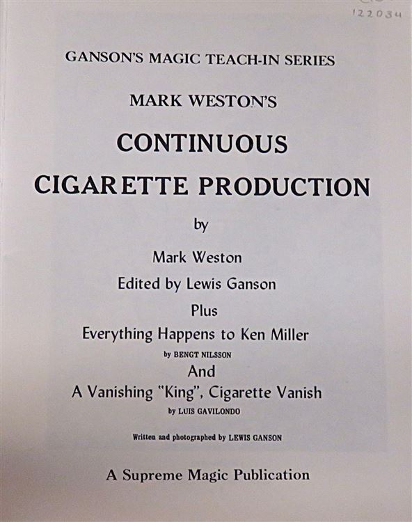 This lovely edition of "Ganson's Magic Teach-In Series: Mark Weston's Continuous Cigarette Production" by Mark Weston and Lewis Ganson is now in the possession of St Mary's Books. Beyond the bright orange pictoral cover depicting the continuous cigarette production trick, one finds 24 pages of immaculately presented text complete with illustrations and black and white photographs (taken by Ganson) detailing three tricks "Continuous Cigarette Production", "Everything Happens to Ken Miller", and "A Vanishing "King"". This book is in very good condition, meaning whatever imperfections there are, they are minor. This book is looking for a new home, and would be the perfect gift for any magician hoping to level up their craft.