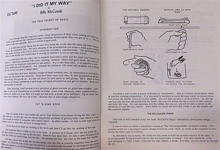 This lovely edition of lecture notes from "I Did It My Way" presented by Billy McComb in 1972 is now in the possession of St Mary's Books. Beyond the cover which features a black and white photograph of McComb, one finds 14 pages of text detailing how to perform several tricks, supplemented with black ink illustrations. This copy is in very good condition, meaning there are no obvious imperfections. It is now looking for a new home, and would be a perfect gift for any amateur magicians.