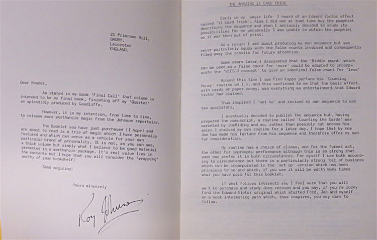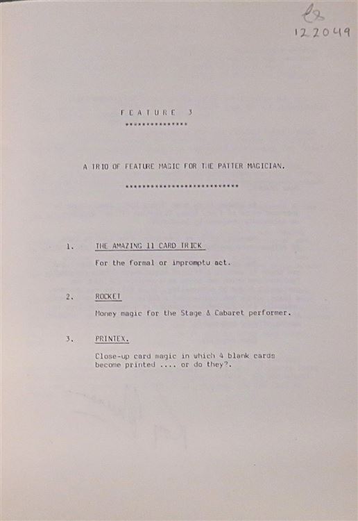 This lovely edition of "Feature Three: A Trio of Feature Magic for the Patter Magician" by Roy Johnson is now in the possession of St Mary's Books. Beyond the bright yellow cover featuring the title in black ink, one finds 16 pages of text, instructing the reader in: "The Amazing 11 Card Trick", "Rocket", and "Printex". This book is in good to very good condition - despite a small stain to the cover it remains a clean and readable copy. This book is looking for a new home, and would be the perfect gift for any magician hoping to improve their craft.