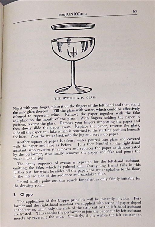 This lovely hardback edition of "ConJUNIORing: Being a balanced programme of magical effects for children" by John Brearly is bound in orange cloth with black ink lettering to the cover and spine. Inside, one finds 95 pages of text, supplemented with black ink illustrations detailing various tricks suitable to perform to children, and the ways to engage with a majority-child audience. This book is in good condition, the front board is slightly warped, there is a small stain on it, and there is some minor foxing throughout, though the copy remains largely clean and readable. This book is looking for a new home, and would be a perfect gift for any magician hoping to improve their range.
