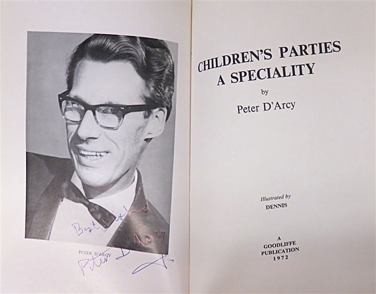 This lovely edition of "Children's Parties: A Speciality" is signed by the author, Peter d'Arcy. This copy has a lovely blue dustjacket which features black and white photographs of props used for magic at children's parties. Beyond the dustjacket, this hardback edition is bound in a lovely blue cloth, and has gilt lettering to its spine. Inside, one finds 97 pages of text detailing how to perform various magic tricks to children, all supplemented with illustrations by "Dennis". This book is in very good condition, though the dustjacket can only be described as fair, the book itself is clean and readable with few visible imperfections. This copy is looking for a new home, and would make for the perfect gift to any performer hoping to improve their range.