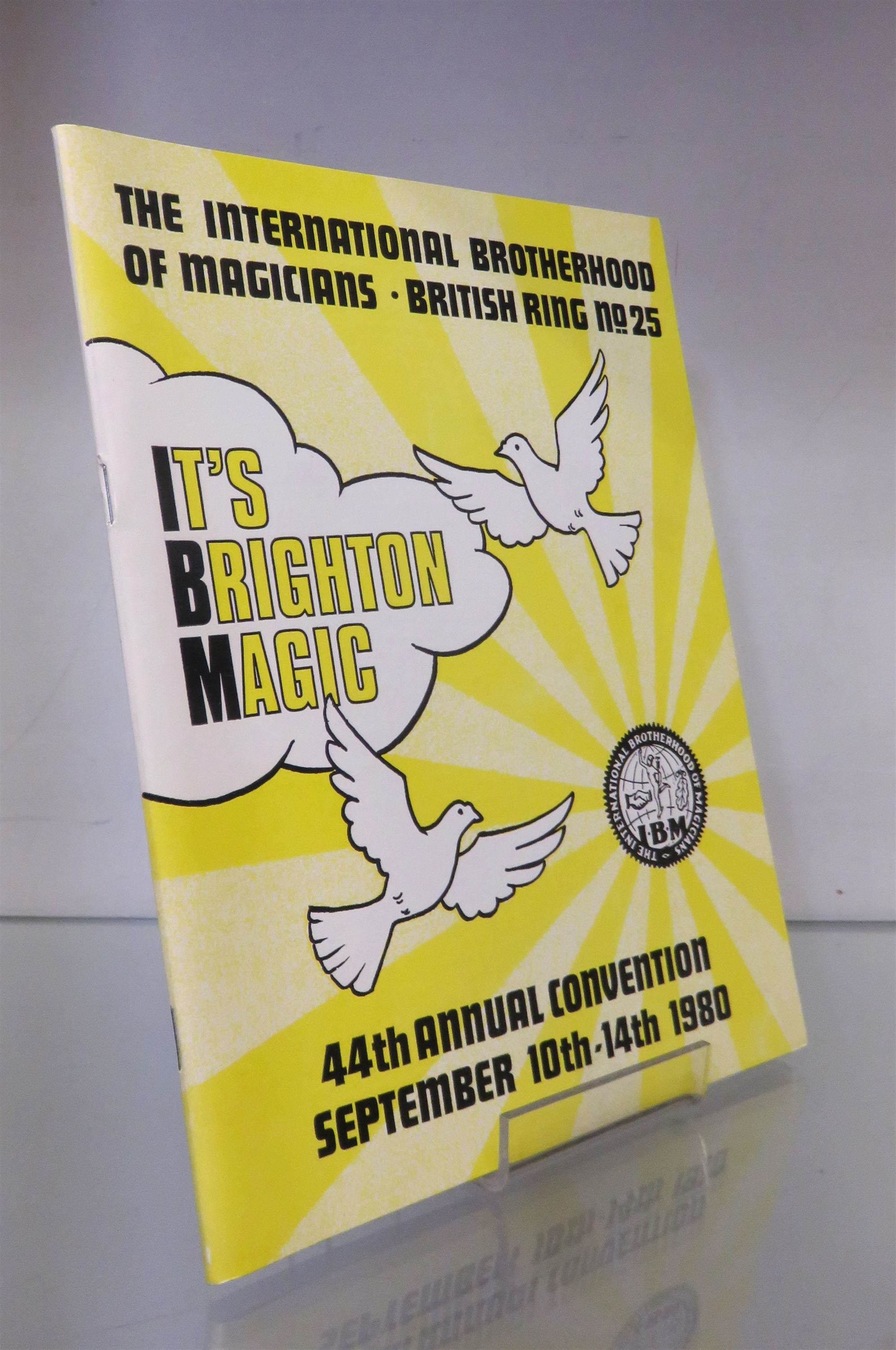 This is the programme for the 44th annual convention of the International Brotherhood of Magicians British Ring No. 25, which took place in Brighton from September 10th-14th, 1980. The front cover is illustrated with a bright yellow design, and the photographs throughout are in black and white. Overall, the programme is in very good condition, with clean and bright pages throughout, and no visible damage to the covers. pp. 48.