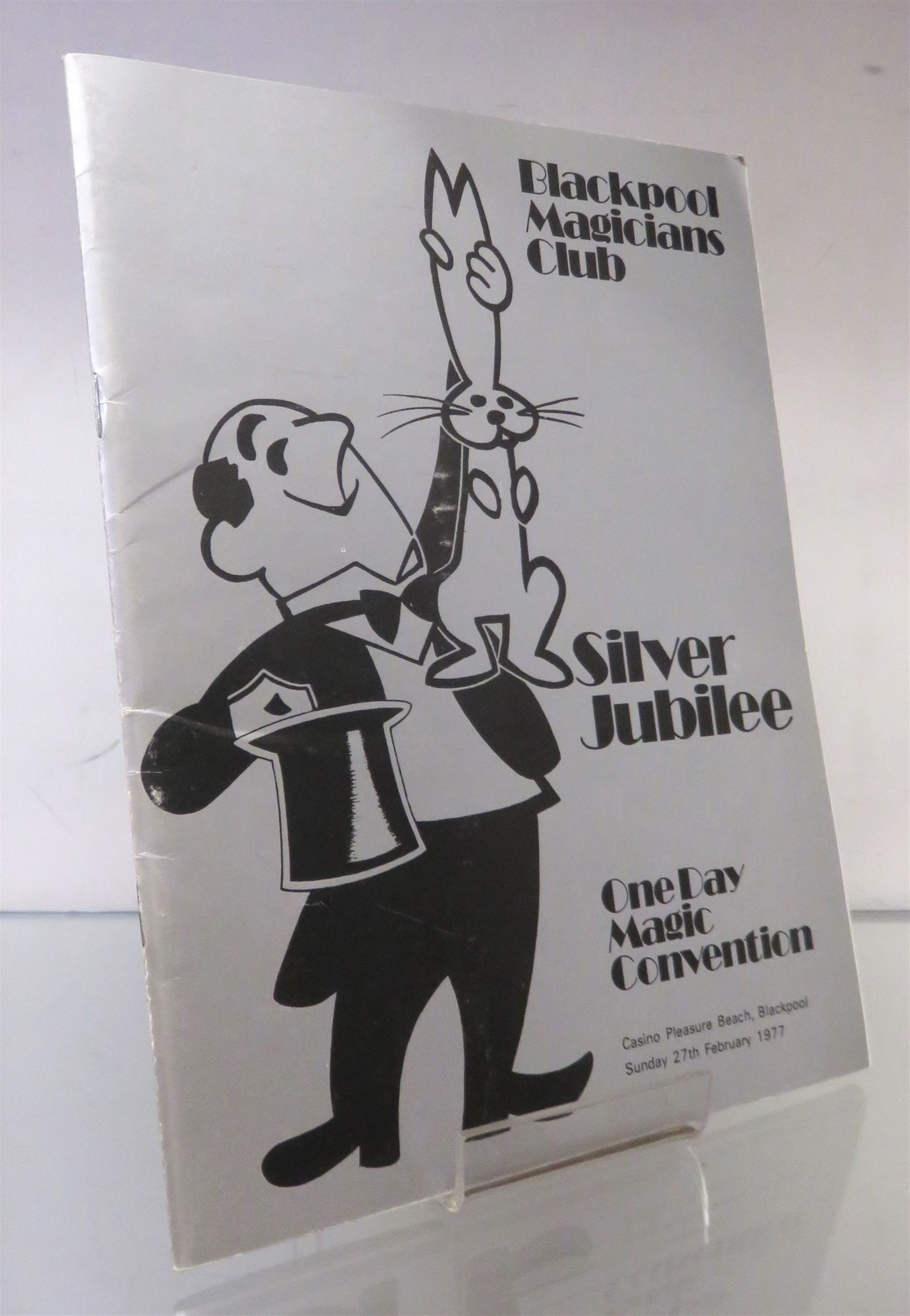 A commemorative programme for the Blackpool Magicians Club's 25th one day magic convention. The covers are silver with a bold black illustration on the front cover. The photographs and designs throughout are in black and white. Overall, it is in very good condition, with some rubbing towards the spine, but with clean and bright pages throughout. pp. 24.