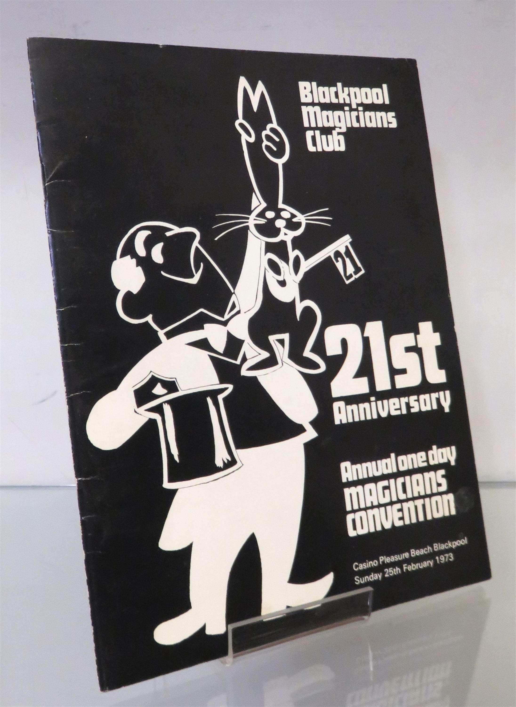 Commemorative programme for the Blackpool Magicians Club's 21st annual one day magicians convention. There is a bold black and white illustration on the front cover and the photographs throughout are also in black and white. In good condition, with some marks on the front and back covers, but the pages are clean and bright throughout. pp. 24.