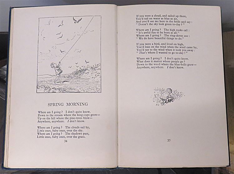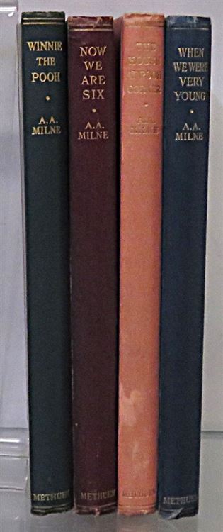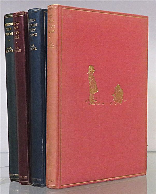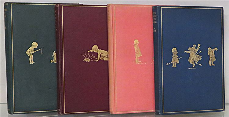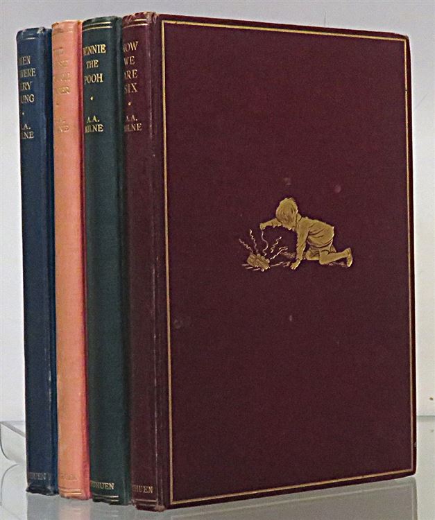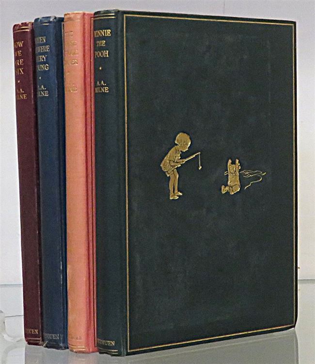 “We'll be Friends Forever, won't we, Pooh?' asked Piglet. 'Even longer,' Pooh answered” A handsome four volume set, with each volume bound in coloured cloth with gilt pictorial to the front, and gilt titles to the spines. Winnie The Pooh Sixth Edition, published 1928, The House At Pooh Corner, First Edition published 1928, When We Very Young, Sixteenth edition published 1927, Now We Are Six Second Edition, published 1927. The binding to the House at Pooh Corner is particuarly bright with just slight fading to the spine. The binding to When We Were Very Young and Now We are Six, shows minor surface wear, however clean with the gilt still bright. Winnie The Pooh shows a little more surface wear to the front board and has a slight lean to the spine. All spines show a little shelf wear. There is a previous owner's signature to one of the prelims to all four books, although the rest of the pages are very clean throughout with no foxing or any further inscriptions. Beautifully illustrated throughout by Ernest H. Shepard. A beautiful set, an ideal gift for any friend of Pooh.