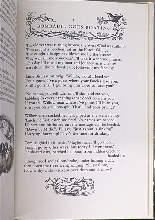 Hardback. Ninth Impression. Complete with a beautifully illustrated dust jacket which is good condition despite some edge wear. Minor tape repair to the underside. Not price clipped. Underneath lie pictorial boards matching the design of the dust jacket with minor shelf wear to the top and base of the spine. The pages appear unread with no marks or inscriptions and the text is enriched by the beautiful illustrations of Pauline Baynes. pp. 64. A collection of poetry from JRR Tolkien, two of whch feature Tom Bombadil, a character Frodo Baggins briefly encounters in The Lord Of The Rings.