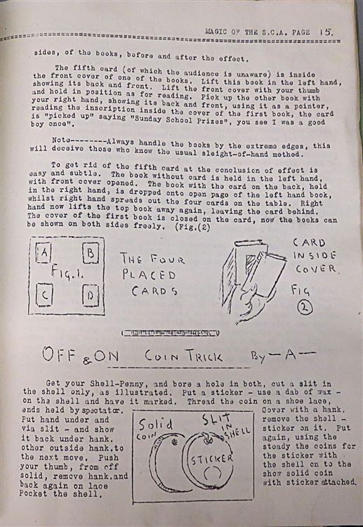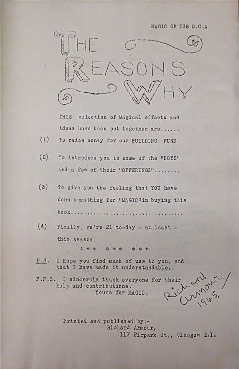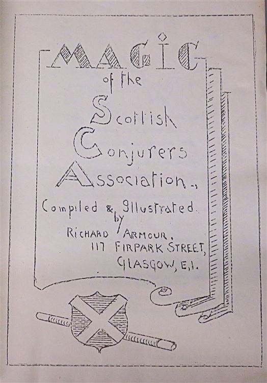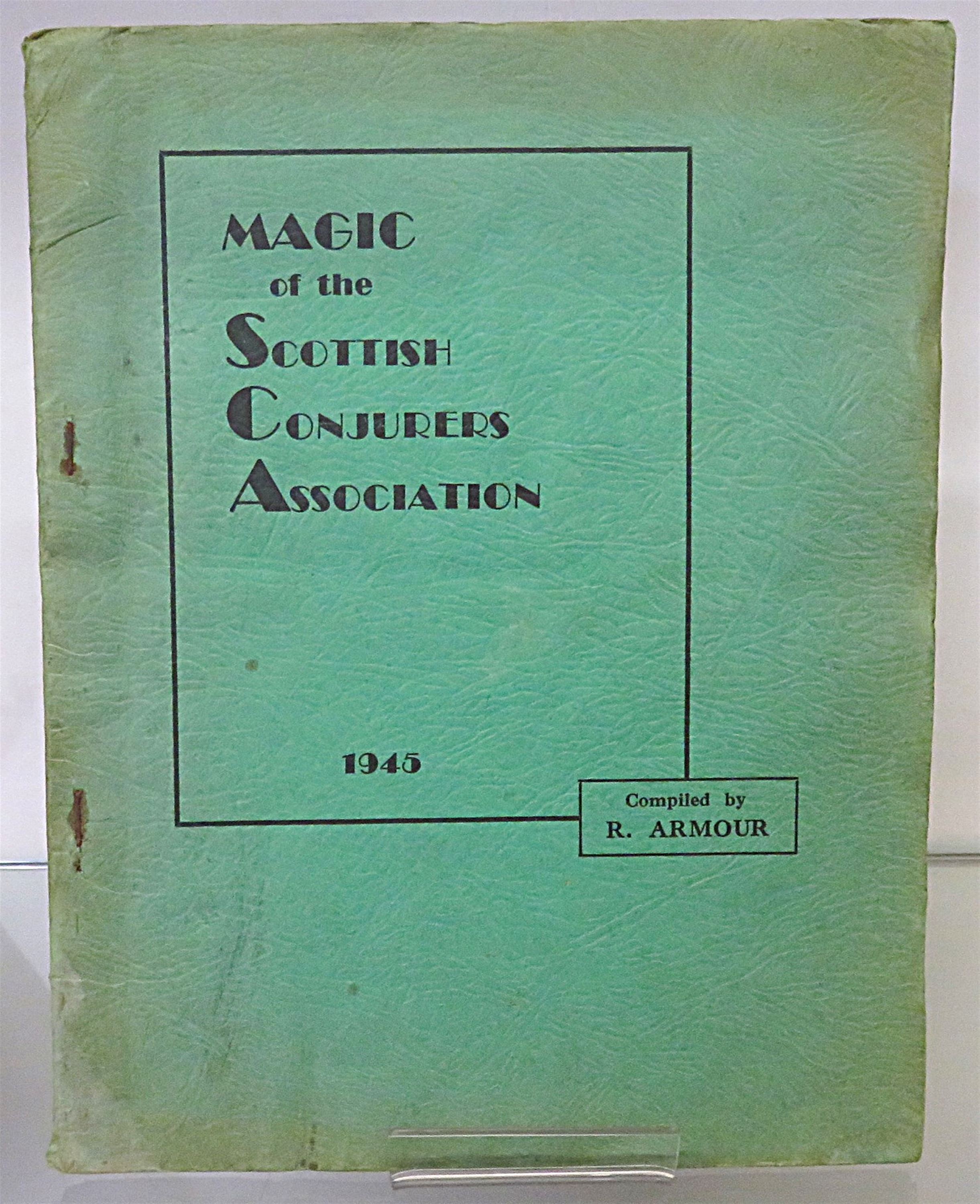 St Mary's Books is proud to present this lovely 1945 First Edition of "Magic of the Scottish Conjurers Association", compiled by Richard Armour. This green paperback book features 29 pages of typed text and hand drawn illustrations which help the reader to better understand the method behind the various magic tricks here exposed. This lovely little book is a slice of history, and though it is not in perfect condition - there is some bumping, wearing, and rust from the staples - it is in remarkable condition for its age and rarity. This book is looking for a new home, and would be the perfect gift for any budding conjurer or historian of Scottish magic.
