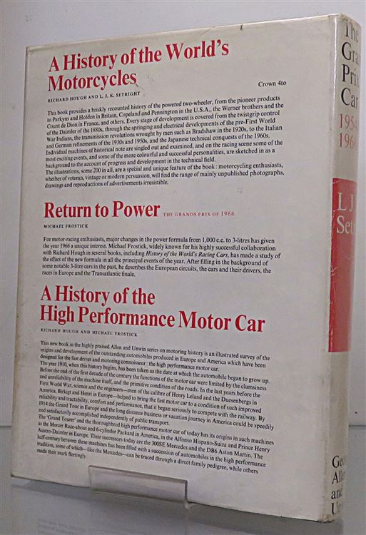Hardback. First Edition A detailed historical analysis of the evolution of the Grand Prix racing car during a pivatol 12 year period, focusing on the technical and design changes in the cars that dominated this era of motorsport. The pictorial dust jacket shows only a little edge wear with a little loss to the front. price clipped. The pages are clean and bright and profusely illustrated with black and white photographic images. pp. 422. Overall a very good copy.