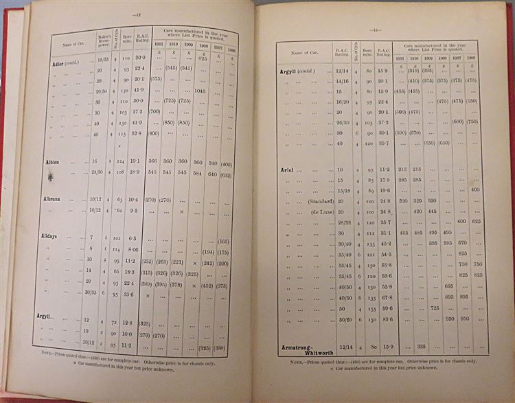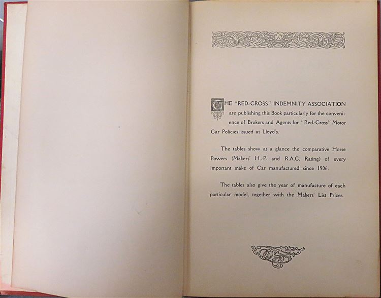This lovely edition of "A List of Motor Cars Manufactured or Sold in the United Kingdom 1906-1911" by W. C. Bersey and W. V. Foucard is now in the possession of St Mary's Books. This hardback book is bound in a bright red cloth, and features stunning gold gilt lettering and decorations to its cover. Inside, one finds 76 pages of text showing "the comparative Horse Powers (Makers' H.-P. and R. A. C. Rating) of every important make of Car manufactured since 1906. The tables also give the year of manufacture of each particular model, together with the Makers' List Prices". This copy is in fair to good condition, the corners of the boards are bumped and there is some staining, however, the interior of the book is clean and readable. This lovely little book is looking for a new home, and would be the perfect gift for the historical motor car enthusiast.