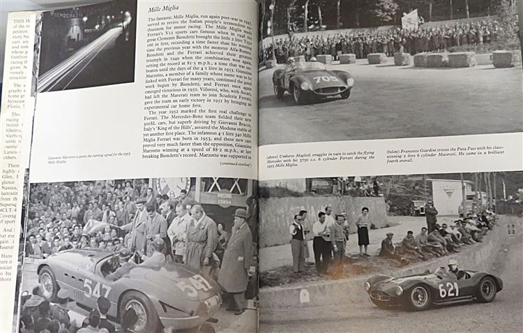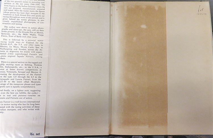 This lovely edition of "Ferrari and Maserati in action 1946-1956" by Hans Tanner, is now in the possession of St Mary's Books. Beneath the bright red pictorial dustjacket which features black and white images of Ferrari and Maserati cars, this hardback book is bound in black cloth, and has silver gilt lettering to its spine. Inside, one finds "a brief glimpse into the enormous amount of racing activity undertaken by the two Modenese firms in all corners of the world", a glimpse which is primarily given through the numerous black and white photographs of the cars which feature throughout the book. This book is in good condition, though there is some bumping and tearing to the dustjacket, and though there is some offsetting to the free endpapers, this is overall a very clean and readable copy, remarkable for its age. This lovely edition is looking for a new home, and would be the perfect gift for any motor racing enthusiast.