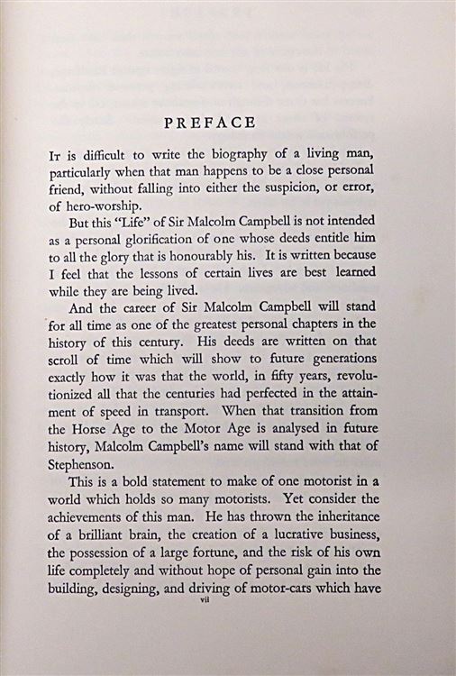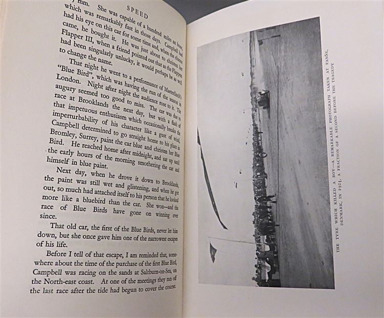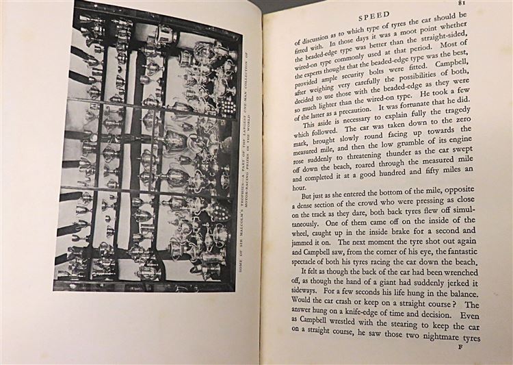 This lovely 1931 first edition of "Speed: The Authentic Life of Sir Malcolm Campbell" by J. Wentworth Day is now in the possession of St Mary's Books. This hardback book is bound in burgundy cloth and features gold gilt lettering to its spine. Inside, one finds 299 pages of text detailing the life of Sir Malcolm Campbell, peppered with black and white photographs. This copy is in good condition, there is some bumping to the corners, fading to the spine, and the inside is lightly foxed - however, this is more than fair given the age and rarity of this first edition. This copy is looking for a new home, and would be the perfect gift for any historical motoring enthusiasts.