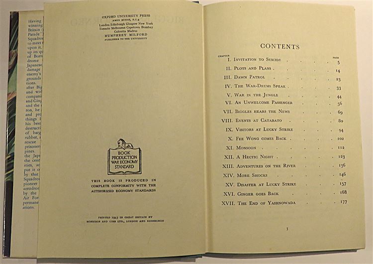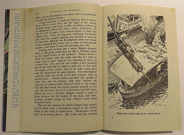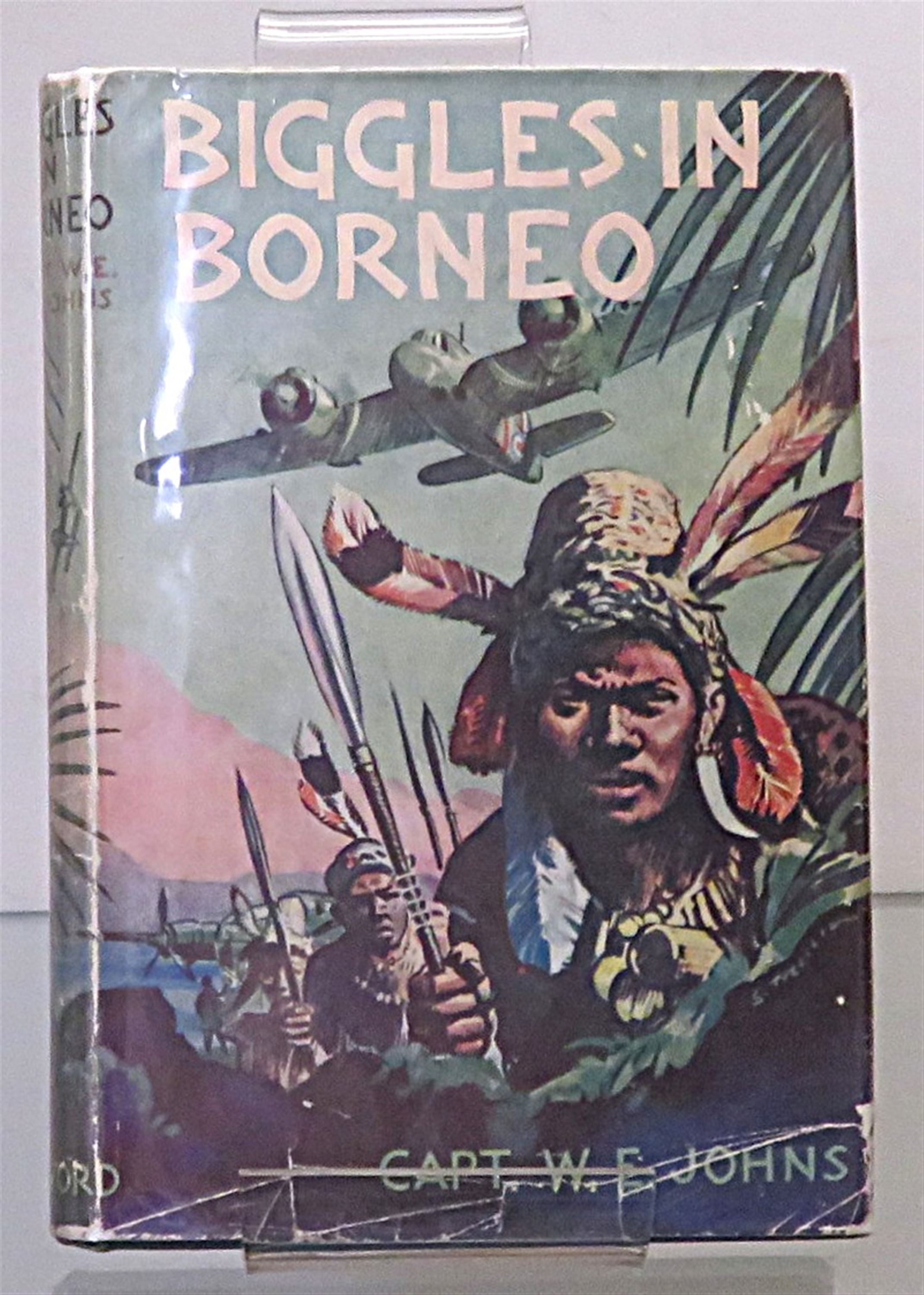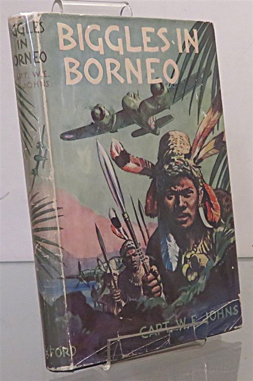Hardback. A First Edition copy of Captain W.E. Johns classic children's series. This story finds Biggles and his 666 squadron establish a secret airfield in the Bornean jungle. The pictorial dust jacket shows a little wear and creasing to the extremities with light fading to the spine. The rear cover shows light pen marks. Slight lean to the spine. Underneath lie bright and clean green cloth boards with printed pictorial to the front and titles to the spine. Neat inscription to the front paste down. The rest of the pages are clean and bright. Illustrated with a full colour frontispiece and several line drawings throughout by Stuart Tresilian. pp. 185. Overall a good copy.