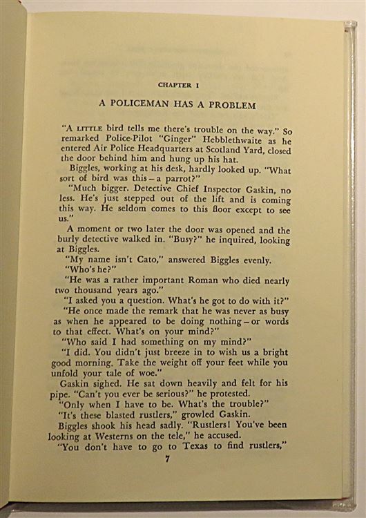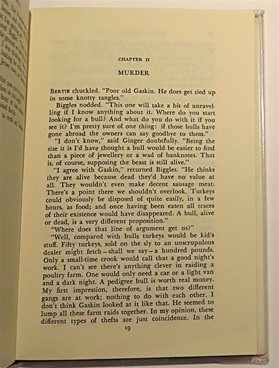 Hardback. A First Edition copy in near fine condition complete with an unclipped dust jacket. The pages show no marks or inscriptions and the binding is in near perfect condition. pp. 160. Biggles and his team help Chief Inspecter Gaskin investigate a series of thefts of champion bulls from a series of farms.