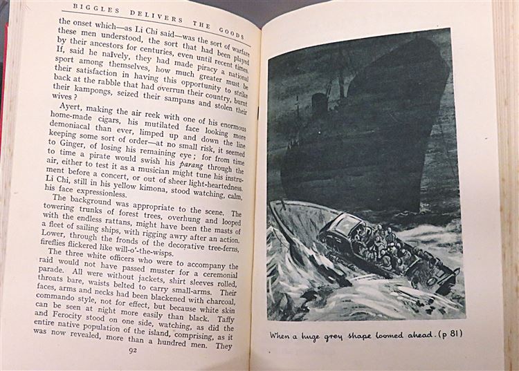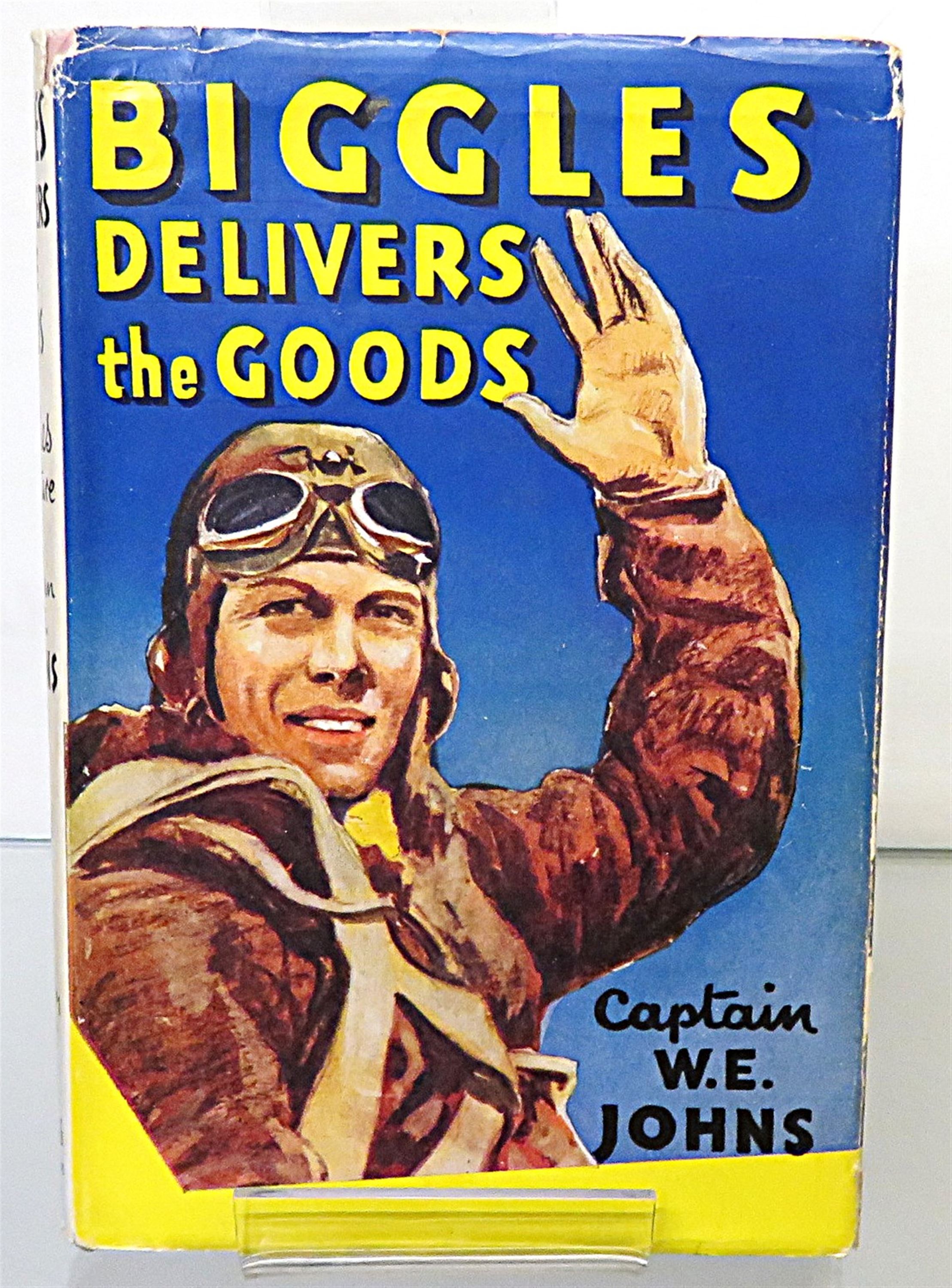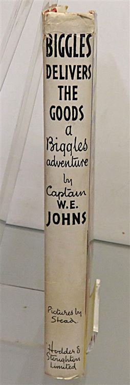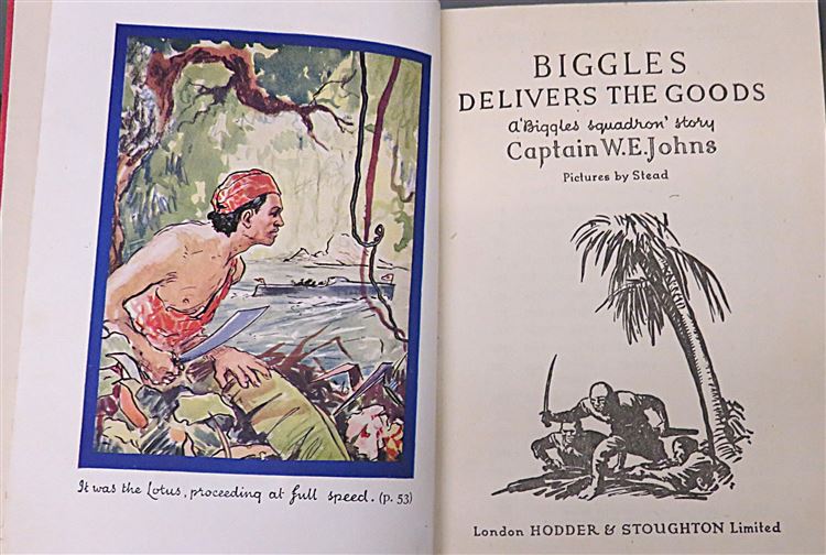 This lovely January 1946 first edition of "Biggles Delivers the Goods" by Captain W. E. Jones is now in the possession of St Mary's Books. Beneath the vibrant illustrated dustjacket, this hardback book is bound in red cloth with black ink lettering to the cover and spine. Inside, beyond the blue ink map of the Bay of Bengal to the free endpapers, and the full-colour illustration of a man in the jungle to the frontispiece, one finds 182 pages of text, peppered with similar black and white illustrations. This book is in good condition - despite some bumping and tearing to the dustjacket, and minor foxing to the book itself, it remaisn a clean and readable copy, remarkable for its age and rarity. This book is looking for a new home, and would be a perfect gift for any Biggles enthusiast.