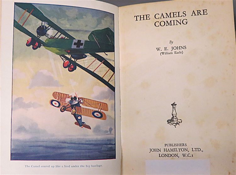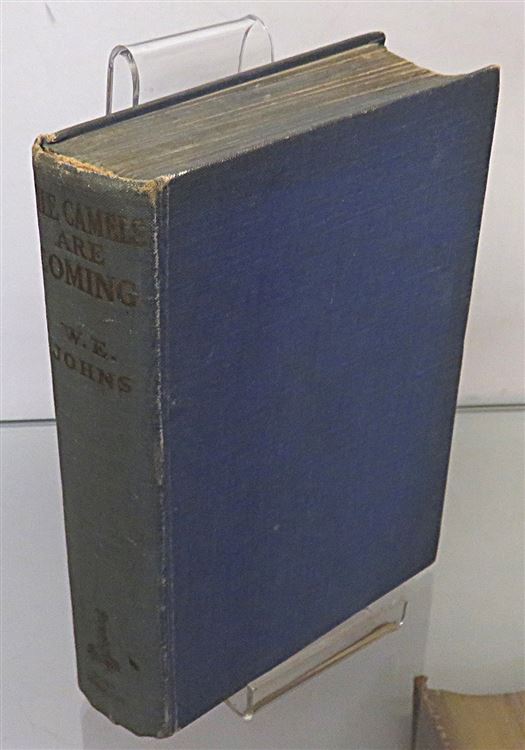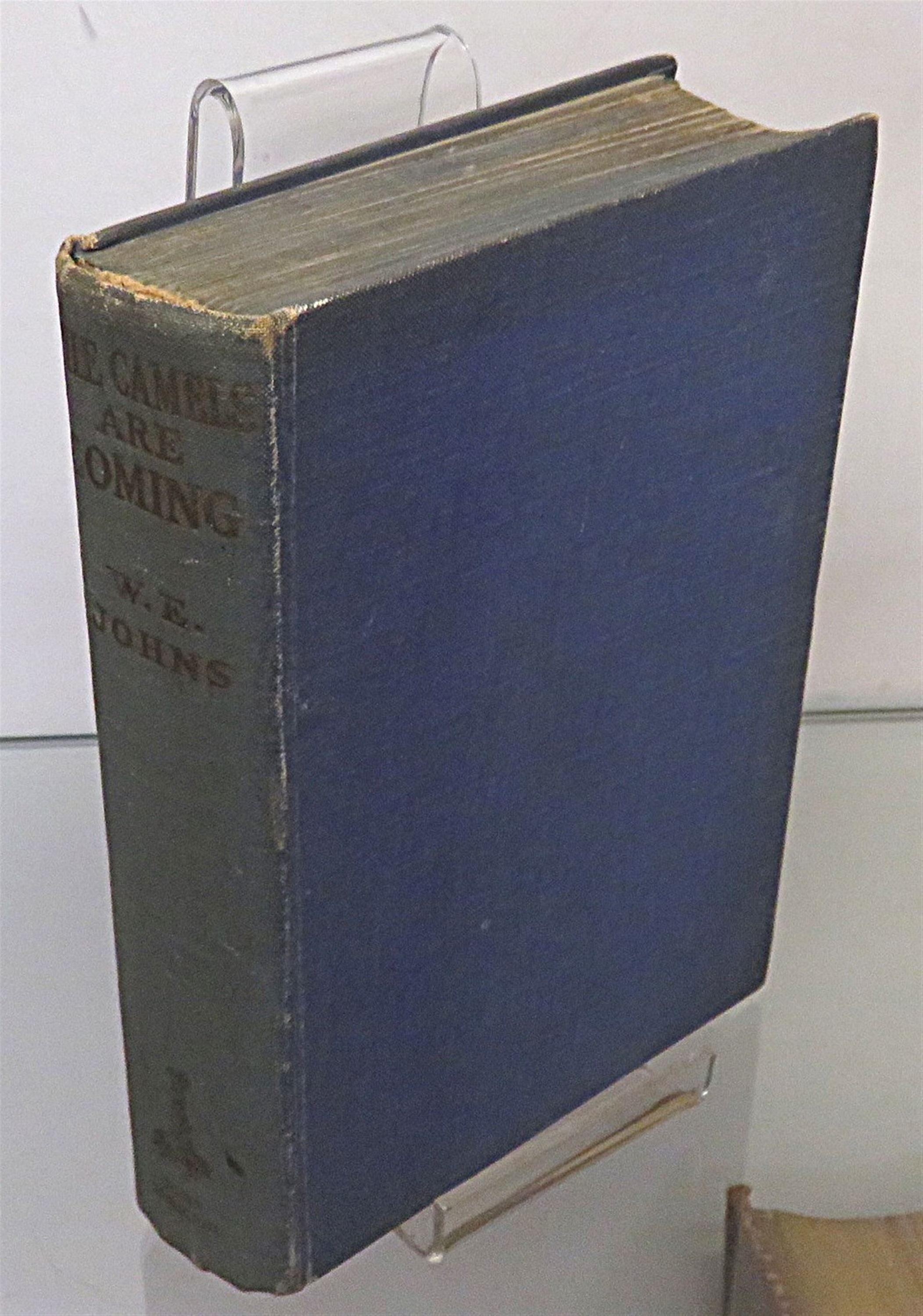 St Mary's Books is proud to present the first ever "Biggles" Book, "The Camels are Coming" by W. E. Johns, published circa 1932. This hardback book is bound in a rich blue cloth with a blue stain to its top edge as well as gold gilt lettering and decorations to its spine. Inside, one finds a stunning full colour illustration of an aviation dogfight to the frontispiece. This book has 239 pages of text, and is peppered with black ink maps and illustrations. This copy is in fair to good condition, the cloth is faded, the corners are bumped, and there is significant foxing to the prelims - however, the main contents of the book remains clean and readable. This book is looking for a new home, and would be the perfect gift for any Biggles collectors.