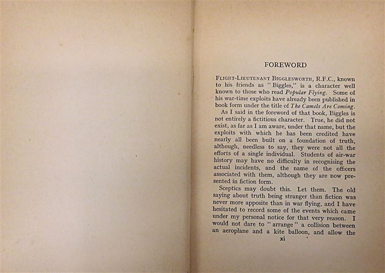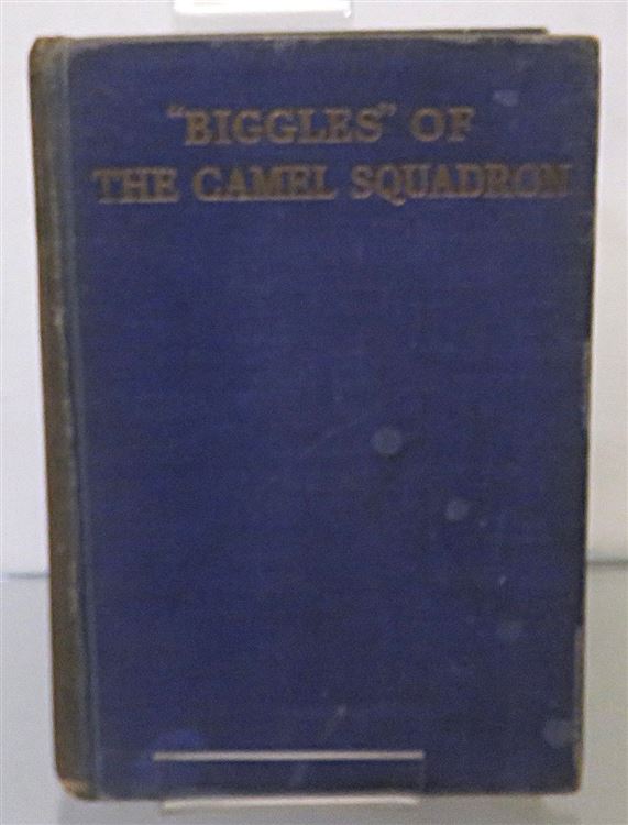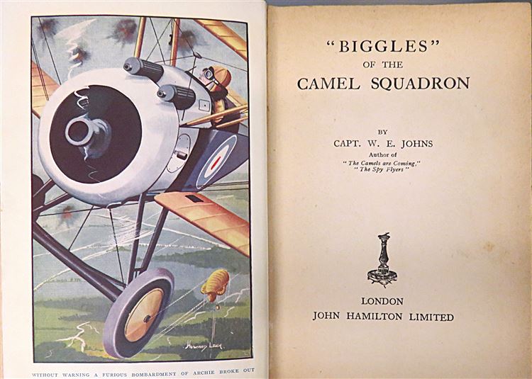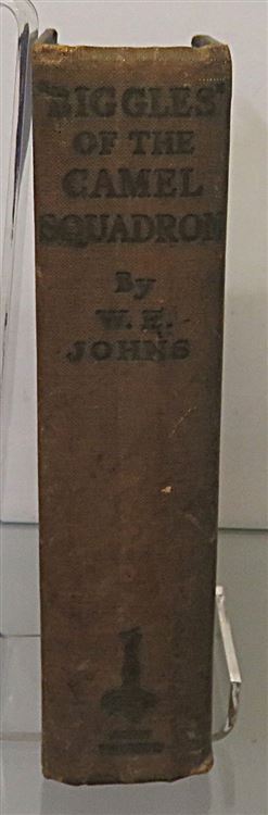 St Mary's Books is proud to present this circa 1934 copy of the third ever "Biggles" book, ""Biggles" of the Camel Squadron" by Captain W. E. Johns. This hardback book is bound in a rich blue cloth and features blue staining to its top edge and gold gilt lettering to its cover and spine. Inside, one finds a stunning full-colour frontispiece depicting a bombardement breaking out around Biggles as he flew. This book has 254 pages of text, including a glossary of terms. This edition is in fair to good condition - there is some staining to the boards, they are bumped and worn and the spine is weak and faded. However, beyond some slight foxing and yellowing pages, this copy nevertheless remains clean and readable, remarkable for its age. This book is looking for a new home, and would make for a perfect gift for any Biggles enthusiasts.