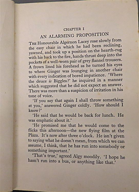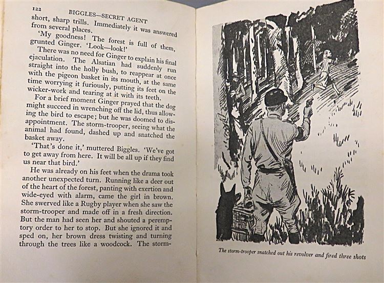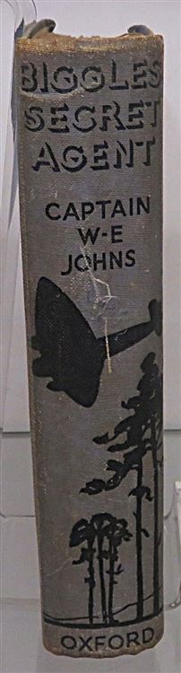 This lovely 1940 first edition of "Biggles - Secret Agent" by Captain W. E. Johns is now in the possession of St Mary's Books. This hardback book is bound in a lovely blue cloth and features black ink lettering and illustrations to the cover and spine, of a man parachuting and of a plane flying over treetops. Inside, one finds 255 pages of text, peppered with charming black ink illustrations. This book is in good condition, though there is some slight bumping, staining, and wear, this is more than fair for the age and rarity of the edition. This book is looking for a new home, and would be a perfect gift for any Biggles enthusiasts.