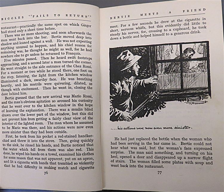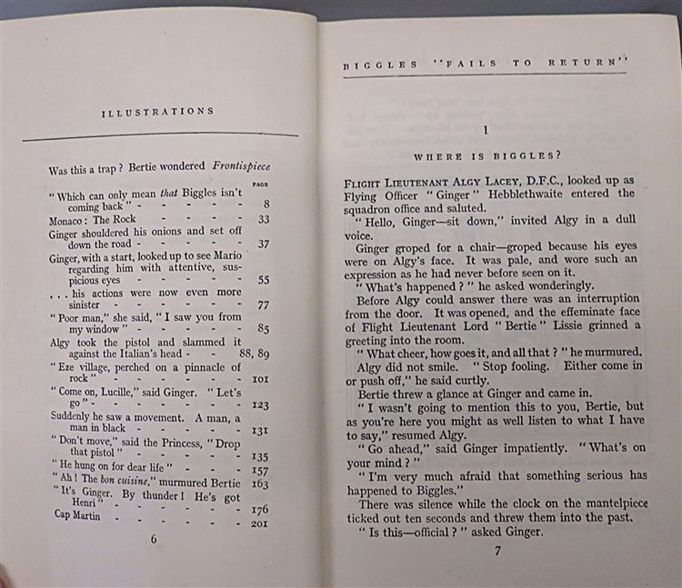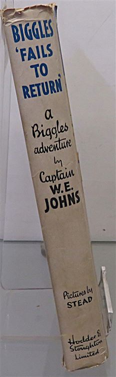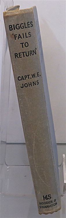 This lovely 1943 first edition of "Biggles "Fails to Return"" by Captain W. E. Johns is now in the possession of St Mary's Books. Beneath the vibrant dustjacket featuring Biggles brandishing a weapon, this hardback book is bound in light blue cloth with black ink lettering to the cover and spine. Inside, beyond the black ink maps illustrated on the free endpapers, this book has a charming full-colour frontispiecewhcih depicts Bertie wondering whether he was about to be trapped. This book has 224 pages of text and is peppered with lovely black ink illustrations. This copy is in good condition - though there is some tearing and bumping to the dustjacket and some fading to the covers, apart from a small inscription, the interior of the book appears remarkably clean and well preserved. This book is looking for a new home, and would be a perfect gift for any Biggles enthusiasts.