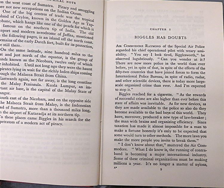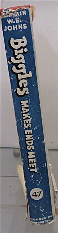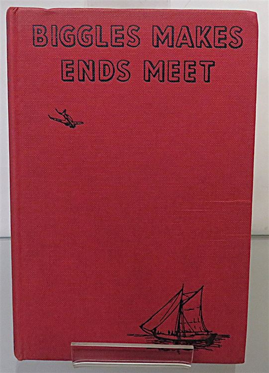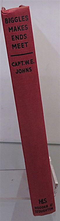 This lovely 1957 first edition of "Biggles Makes Ends Meet" by Captain W. E. Johns is now in the possession of St Mary's Books. Beneath the vibrant dustjacket featurinng men reaching towards the reader, this hardback book is bound in a bright crimson cloth with black ink lettering and illustrations of ships. Inside, beyond the stunning full-colour frontispiece of Ginger loosing his balance, this book has 192 pages of text supplemented by similar full page full-colour illustrations. This book is in good condition, though the dustjacket has singifcant rips and bumps and thus can only be described as fair, the book itself remains clean and readable with few notable imperfections. This book is looking for a new home, and would make for a perfect gift for any Biggles enthusiasts.