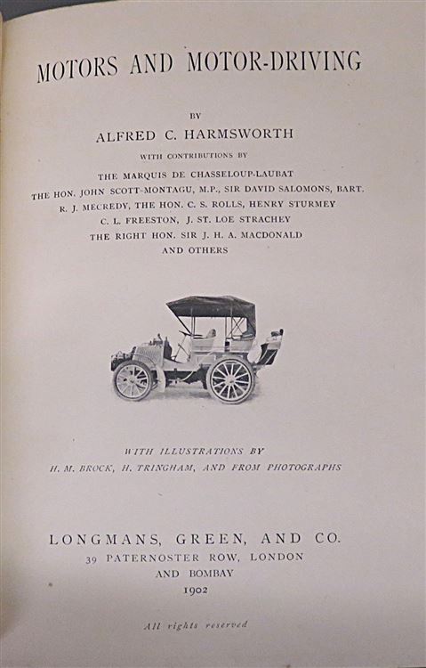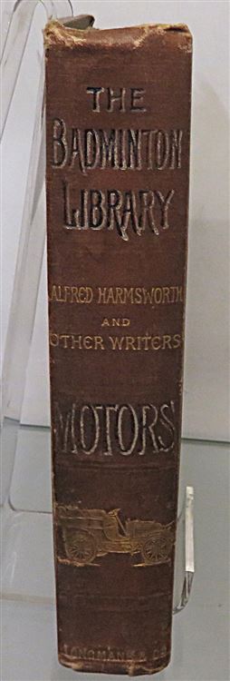 This lovely circa 1902 edition of "The Badminton Library: Motors and Motor-Driving" by Alfred Harmsworth, with contributions by several other writers, is now in the possession of St Mary's Books. Bound in brown cloth, the front board features stunning black and red ink illustrations of the Badminton Library, and beautiful gilt decorations and lettering to the spine. Inside, one finds 460 pages of text, peppered with diagrams, illustrations, and black and white photographs. This book is in good condition - there is some wearing to the illustrations on the cover, and some bumping to the boards. In addition, the front free endpapers and some other prelims are missing and so the book begins with the frontispiece. This makes it difficult to place this books year and edition, but we estimate it to be around 1902. This lovely book is looking for a new home, and would make for a perfect gift for any vintage motoring enthusiasts.