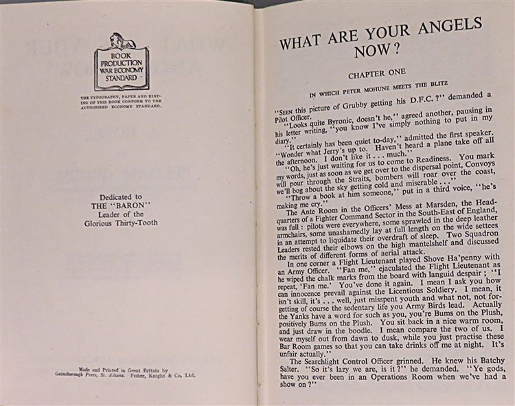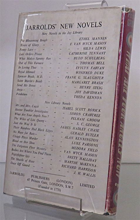 Hardback. Another wartime story to feature Squadron Leader Mohune, this time Mohune is shot down in a sweep over France. The unclipped dust jacket is worn to the extremities with a little fading to the spine. Slight tape repair to the underside. While underneath the turquoise cloth boards show a little foxing with minor foxing to the front paste down. The rest of the pages are clean throughout. Overall the book presents well despite it's flaws. pp. 188. Scarce title.