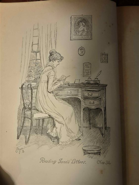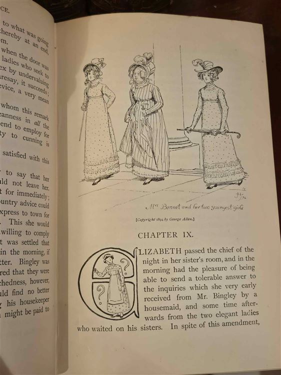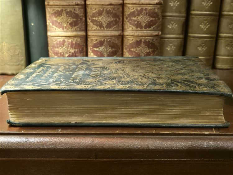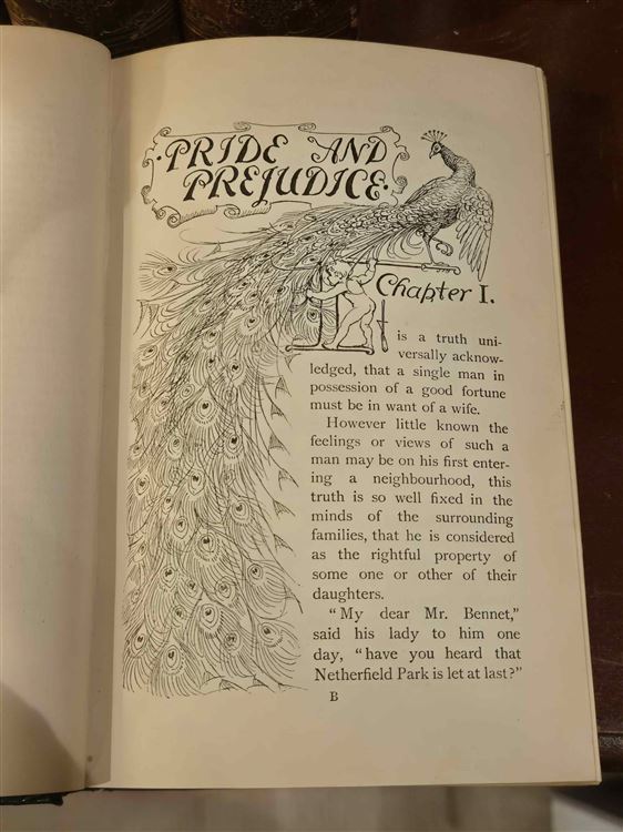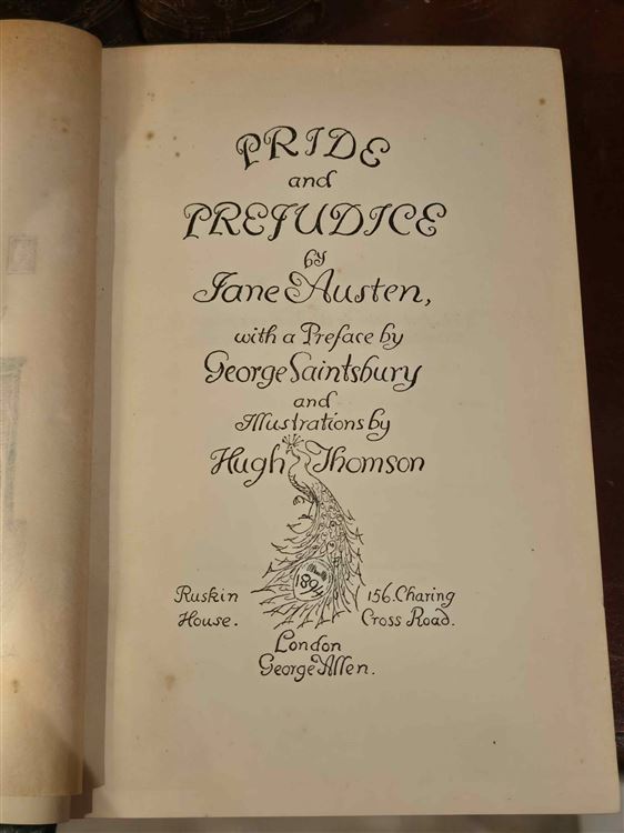St Mary's Books is proud to present this stunning 1895 first edition, second impression of Jane Austen's iconic work, "Pride and Prejudice". This exceptionally bright hardback copy, bound in a lovely forest green cloth with all edge gilt, features Hugh Thompson's gorgeous gold gilt illustrated peacock to its cover, and further peacock motifs to its spine. Inside, past the stunning dark green free endpapers and facsimile signature, one finds further charming illustrations by Thompson, such as the frontispiece "Reading Jane's letters", and as decorations throughout the book. This book has i-xxvii, and 476 pages of text housing Austen's most famous and classic tale - the perfect gift to celebrate 250 years since Jane Austen's birth. This book is in very good condition - though there are some slight bumps and signs of wear, and some minor foxing to the prelims, this is otherwise a very clean, bright, and readable copy of a wonderful piece of literature.