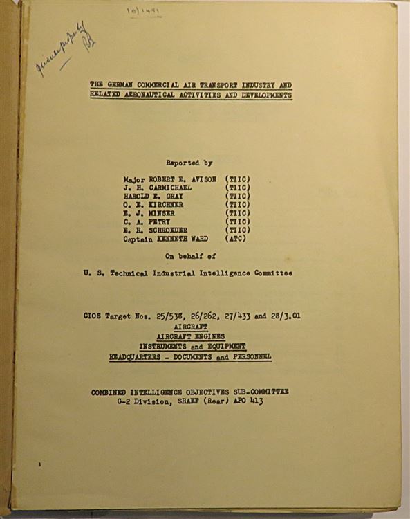 Reported by Major Robert E. Avison, J.H. Carmichael, Harold E. Gray, O.E.Kirchner, E.J. Minser, C.A. Petry, E.H. Schroeder and Captain Kenneth Ward. On Behalf of U.S. Technical Industrial Intelligence Committee. CIOS Target Nos. 25/538, 26/262,27/433, and 28/3.01. Aircraft, Aircraft Engines, Instruments and Equipment, Headquarters-Documents and Personnel.