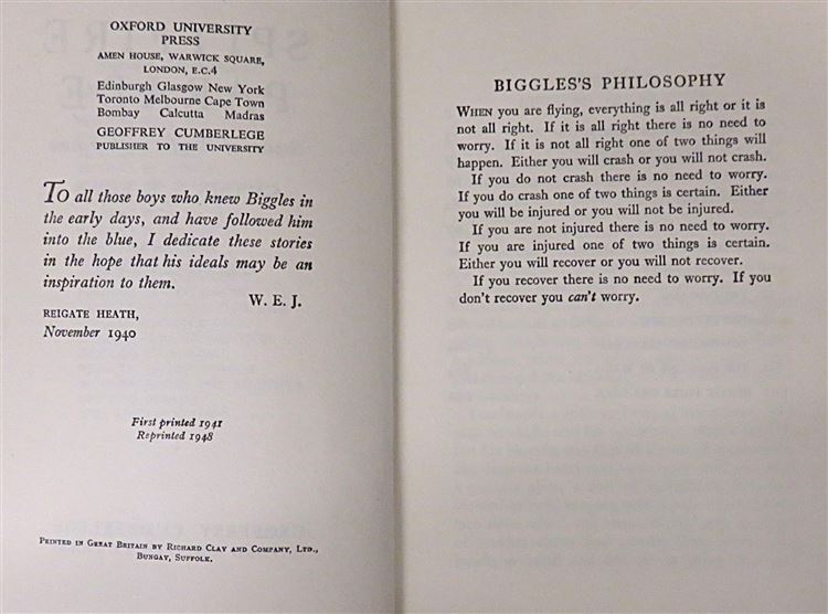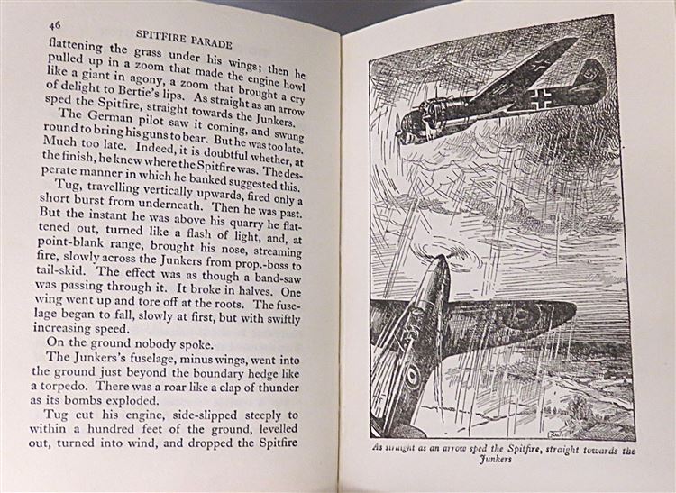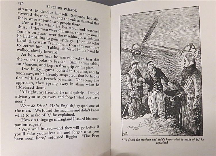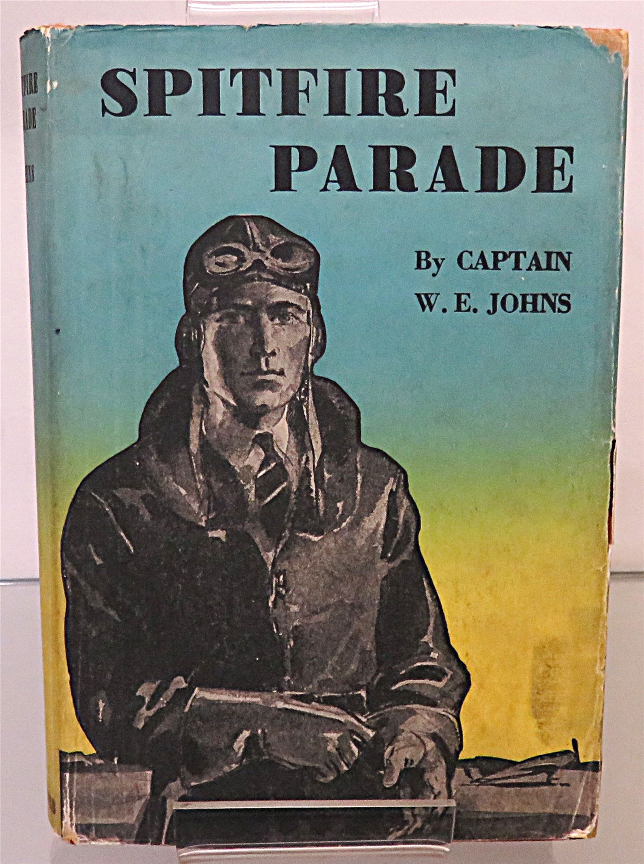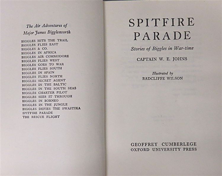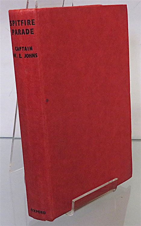 This lovely 1948 reprint of "Spitfire Parade" by Captain W. E. Johns, part of the "Biggles in War-Time" series, is now in the possession of St Mary's Books. Beneath the charming teal and yellow dustjacket featuring a black and white illustration of "Biggles" by Radcliffe Wilson, this hardback book is bound in bright crimson cloth with black ink lettering to its spine. Inside, one finds 256 pages of text, supplemented by full page black ink illustrations. This book is in good condition - though there is some bumping and wear to the dustjacket, which can be described as good to fair, the interior of the book remains clean and readable, remarkable given its age. This book is looking for a new home, and would be the perfect gift for a "Biggles" enthusiast.
