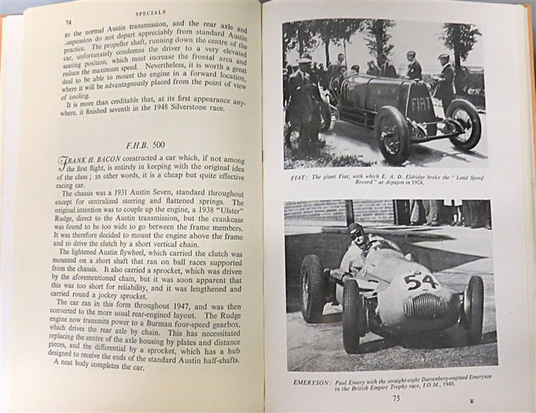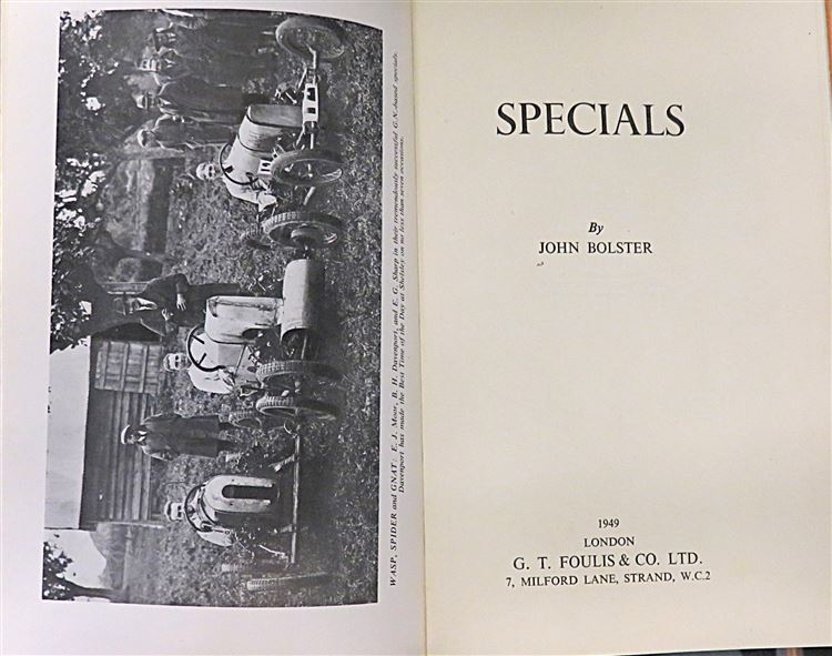This lovely 1949 first edition of "Specials" by John Bolster has come into the possession of St Mary's Books. Beneath the charming butter yellow dustjacket featuring a black and white photograph of a man racing a "Special", this hardback book is bound in an orange cloth with black ink lettering to its spine. Inside, one finds 170 pages of text, supplemented by black and white photographs, including the charming image on the frontispiece of "WASP", "SPIDER", and "GNAT". This book is in very good condition, though there are some small stains and tears to the dustjacket, which can thus only be described as fair to good, the book itself is in excellent condition, with few notable imperfections. This book is looking for a new home, and would make for a wonderful gift.