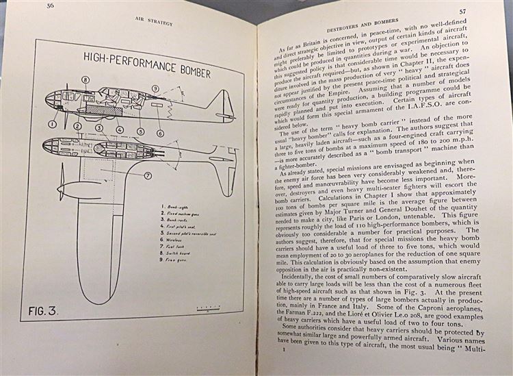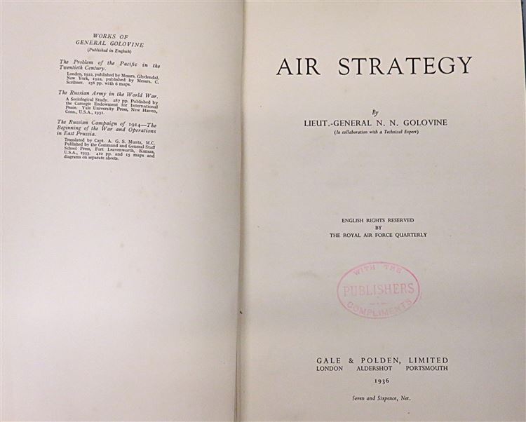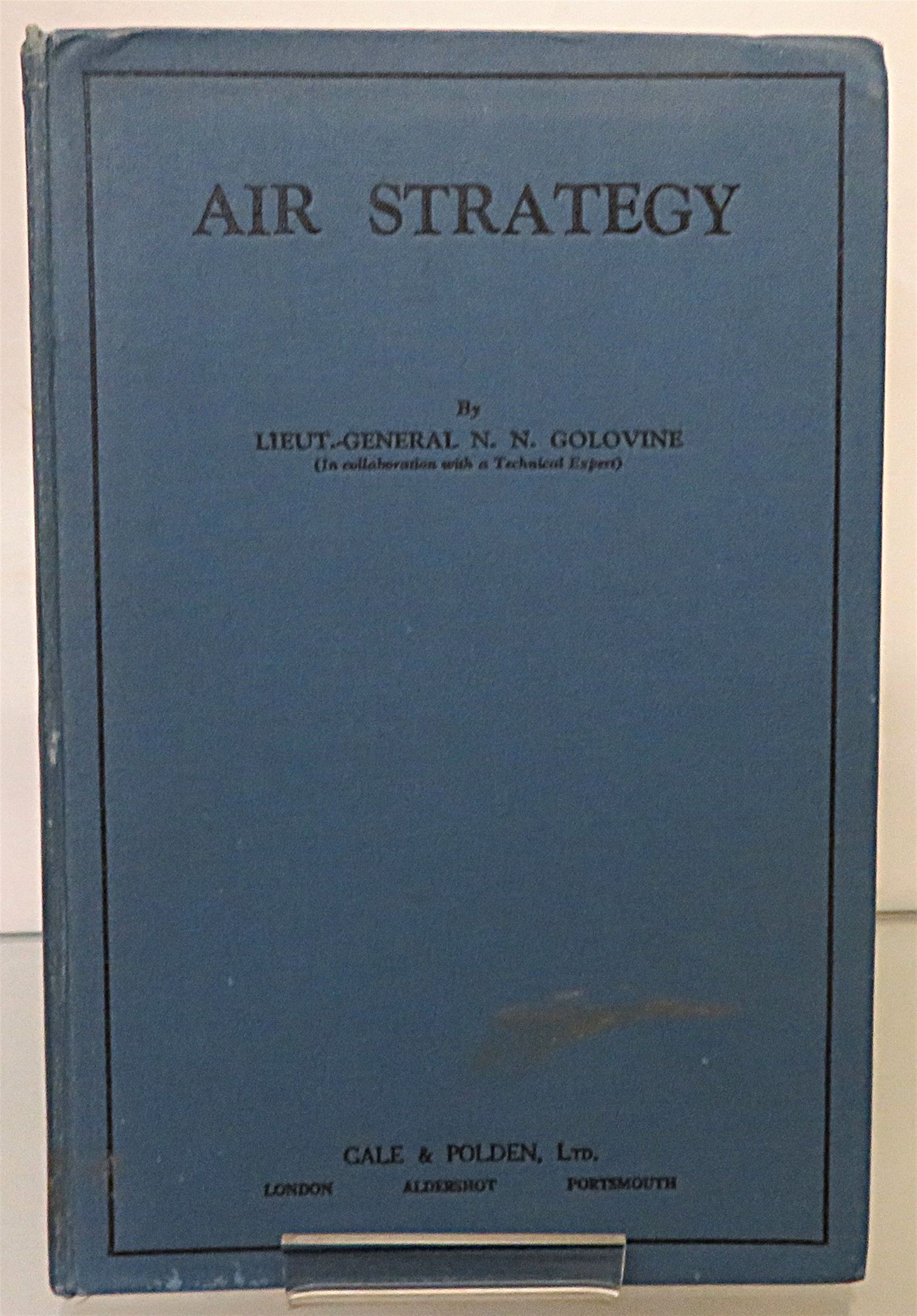 This lovely hardback 1936 first edition of "Air Strategy" by Lieut-General N. N. Golovine is bound in blue cloth, with black ink lettering to its cover and spine. Inside, one finds 114 pages of text, supplemented by maps, tables, and other diagrams detailing widely adopted principles of the new military science of air strategy. This book is in good condition - other than some bumping, a small stain to the cover, and some minor foxing to the prelims, it is an otherwise clean and readable copy. This book is looking for a new home, and would make for a perfect gift.